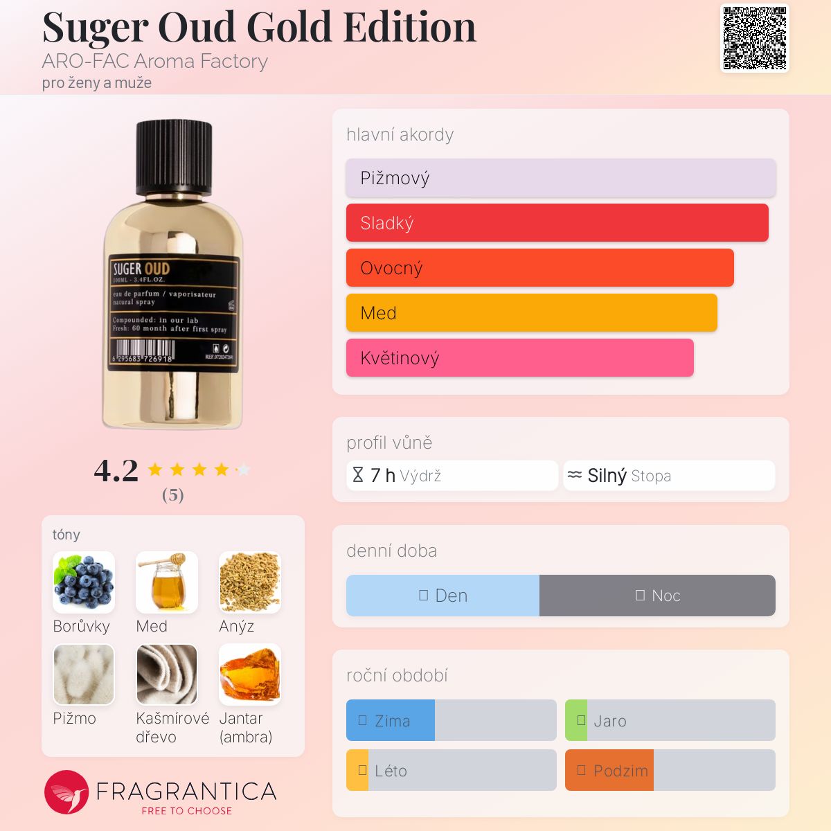 Suger Oud Gold Edition podle ARO-FAC Aroma Factory je Floral Fruity Gourmand vůně pro ženy a muže. Toto je nová vůně. Suger Oud Gold Edition byl/a uveden/a v roce 2024. Vrchní tóny jsou Borůvky a Anýz; střední tóny jsouKašmírové dřevo, Květinové tóny a Rozmarýn ; základní tóny jsou Med, Pižmo a Jantar (ambra).