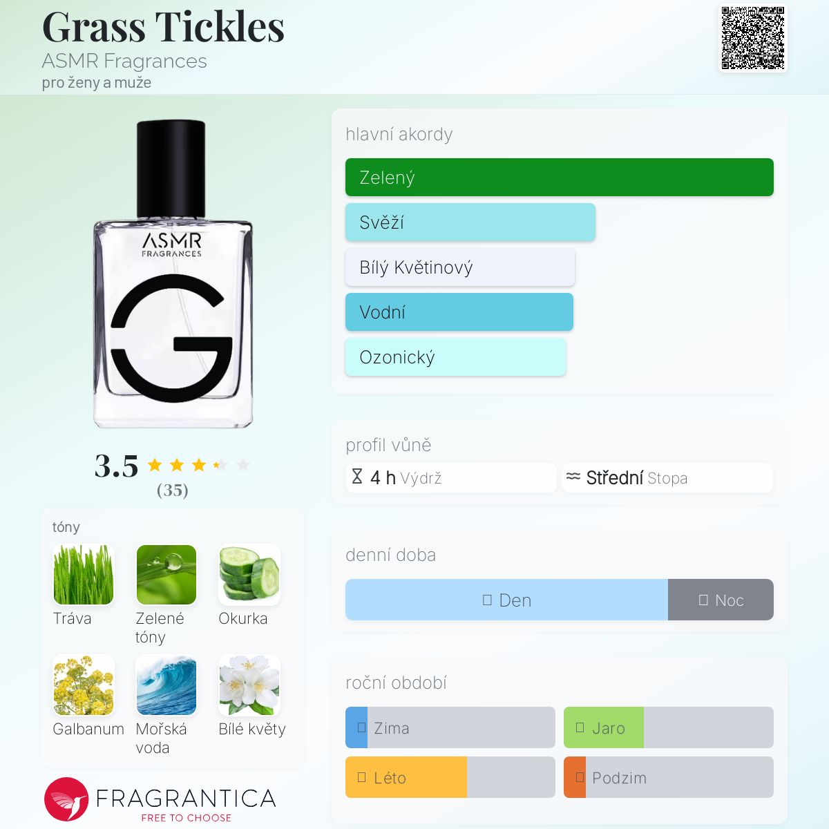 Grass Tickles podle ASMR Fragrances je Aromatic Green vůně pro ženy a muže. Toto je nová vůně. Grass Tickles byl/a uveden/a v roce 2024. "Nosem" za touto vůní je Marie Duchêne. Vrchní tóny jsou Tráva, Okurka, Galbanum a Vodní tóny; střední tóny jsouZelené listí, Bílé květy, Jasmín a Fíkový list ; základní tóny jsou Pižmo, Světlá dřeva a Cedr.