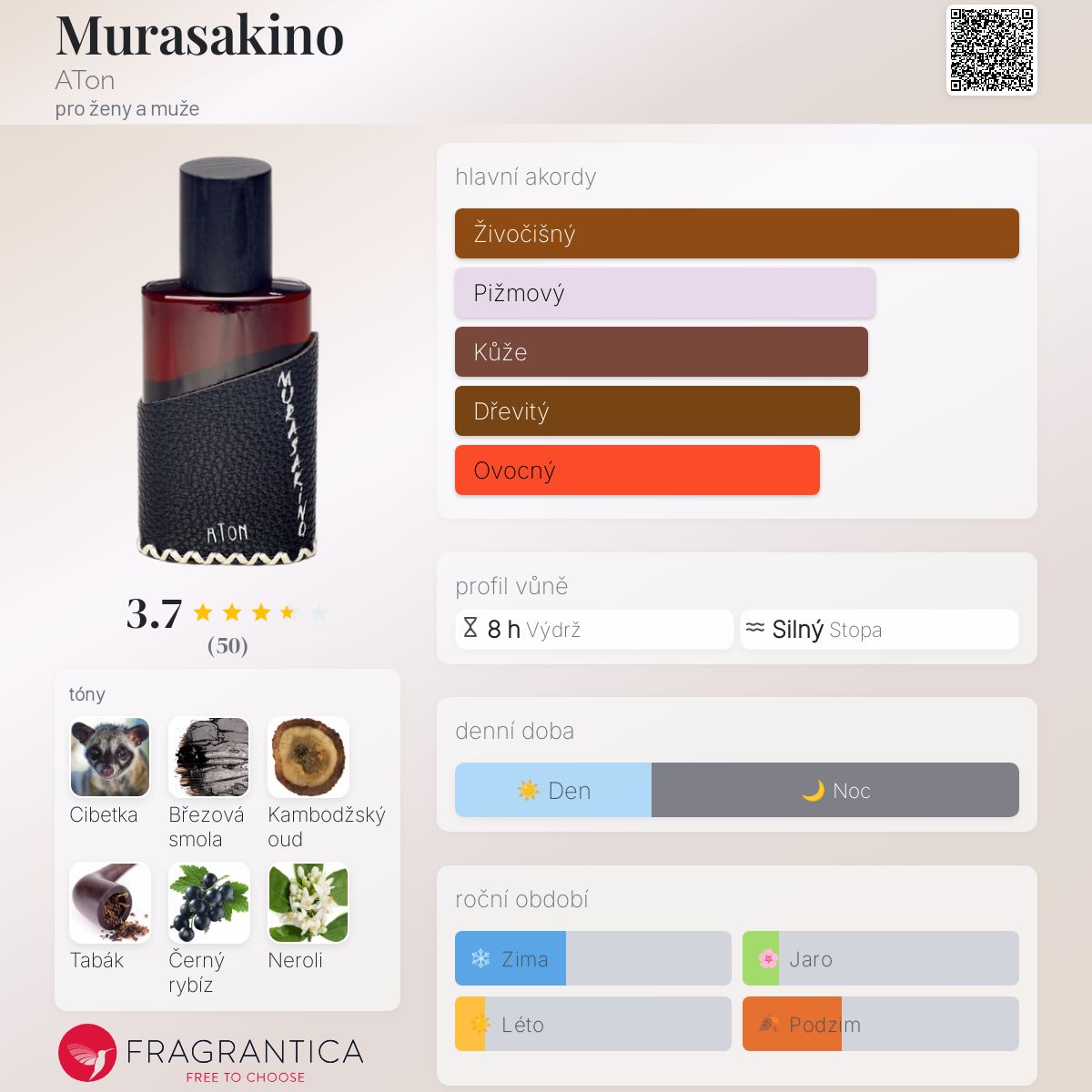 Murasakino podle ATon je Chypre vůně pro ženy a muže. Toto je nová vůně. Murasakino byl/a uveden/a v roce 2024. "Nosem" za touto vůní je Aton Gerasimov. Vrchní tóny jsou Neroli, Ylang-Ylang, Heřmánek a Jasmín; střední tóny jsouCibetka, Kambodžský oud, Tabák a Broskev ; základní tóny jsou Březová smola, Černý rybíz, Levandule a Šafrán.
