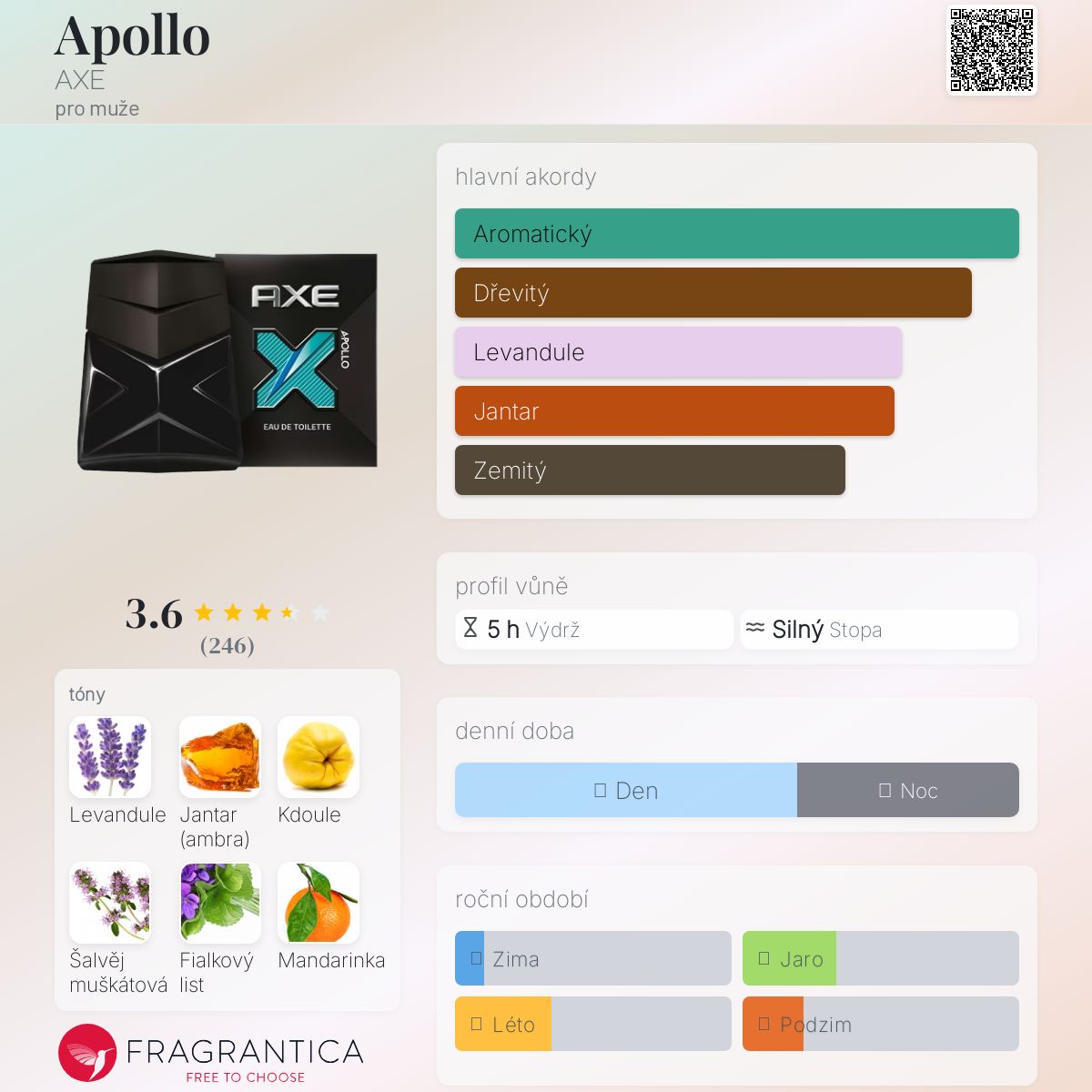Apollo podle AXE je Aromatic Fougere vůně pro muže. Apollo byl/a uveden/a v roce 2013. "Nosem" za touto vůní je Ann Gottlieb. Vrchní tóny jsou Kdoule, Šalvěj muškátová a Mandarinka; střední tóny jsouLevandule, Fialkový list, Kosatec a Pelargónie ; základní tóny jsou Jantar (ambra), Mech, Santalové dřevo, Kašmírové dřevo a Vetiver.