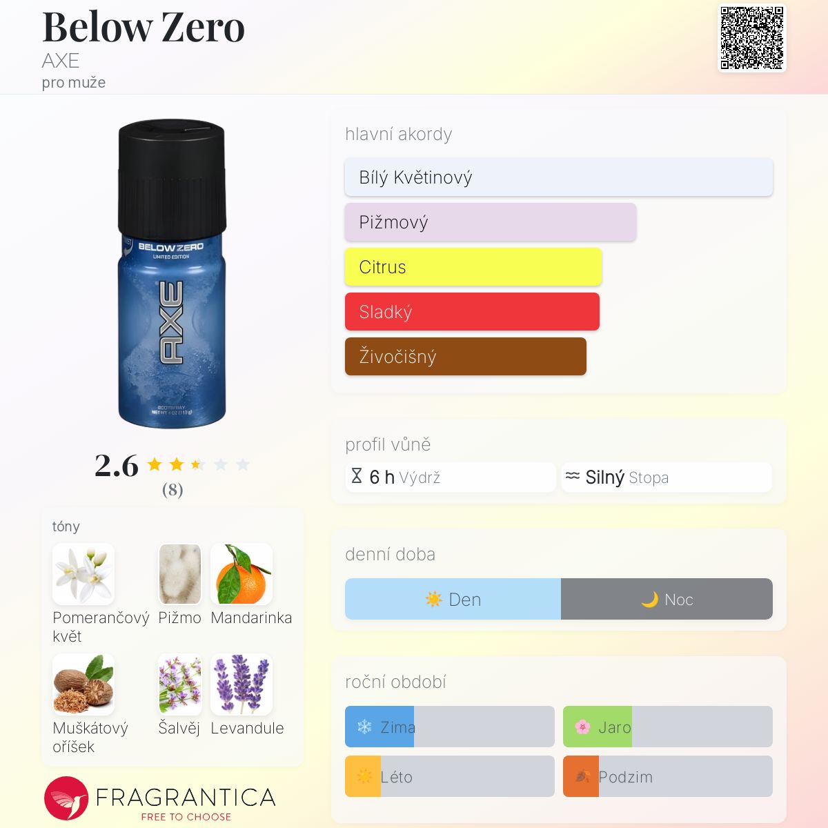 Below Zero podle AXE je Aromatic vůně pro muže. Below Zero byl/a uveden/a v roce 2013. Vrchní tóny jsou Mandarinka, Muškátový oříšek, Šalvěj a Levandule; střední tóny jsouPomerančový květ a Cedr ; základní tóny jsou Pižmo a Pačuli.