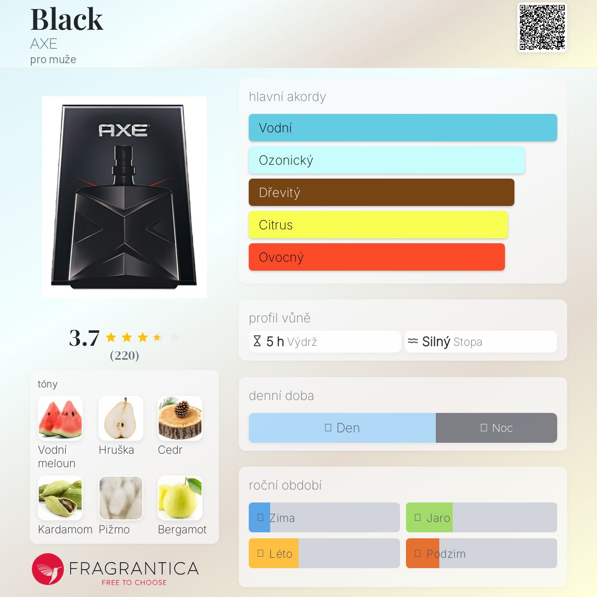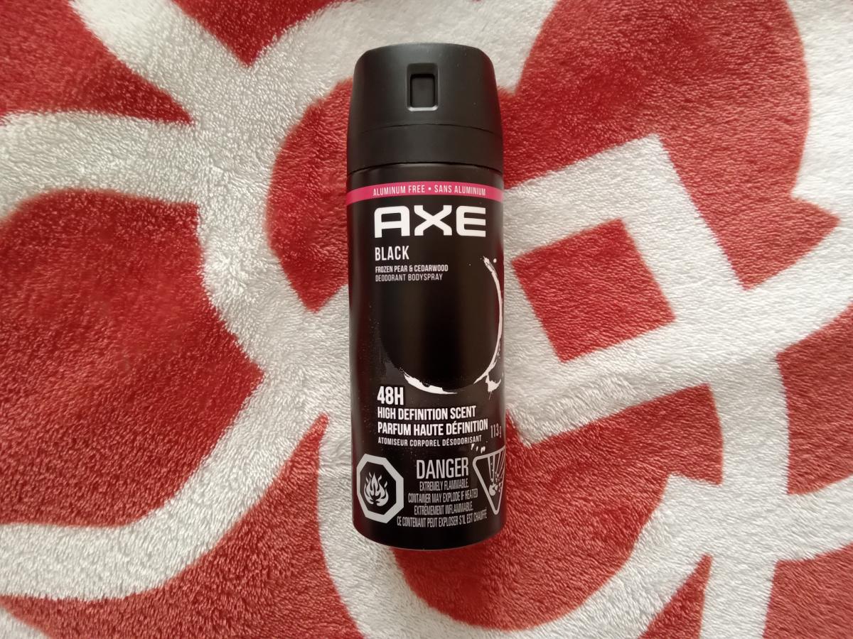Black podle AXE je Woody Aromatic vůně pro muže. Black byl/a uveden/a v roce 2015. "Nosem" za touto vůní je Ann Gottlieb. Vrchní tóny jsou Vodní meloun, Hruška, Bergamot a Mandarinka; střední tóny jsouKardamom a Frézie ; základní tóny jsou Cedr, Pižmo a Pačuli.