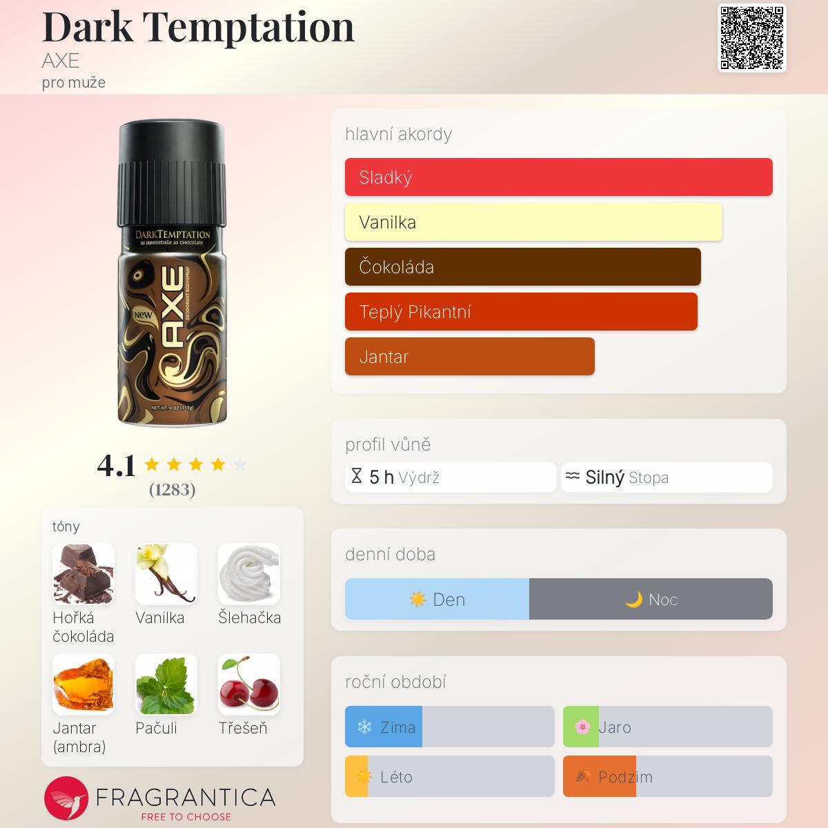 Dark Temptation podle AXE je Orientální Fougere vůně pro muže. Dark Temptation byl/a uveden/a v roce 2013. "Nosem" za touto vůní je Ann Gottlieb. Vrchní tóny jsou Třešeň, Hruška, Zázvor a Koriandr; střední tóny jsouČervená paprička, Šalvěj a Bazalka ; základní tóny jsou Hořká čokoláda, Vanilka, Šlehačka, Jantar (ambra) a Pačuli.
