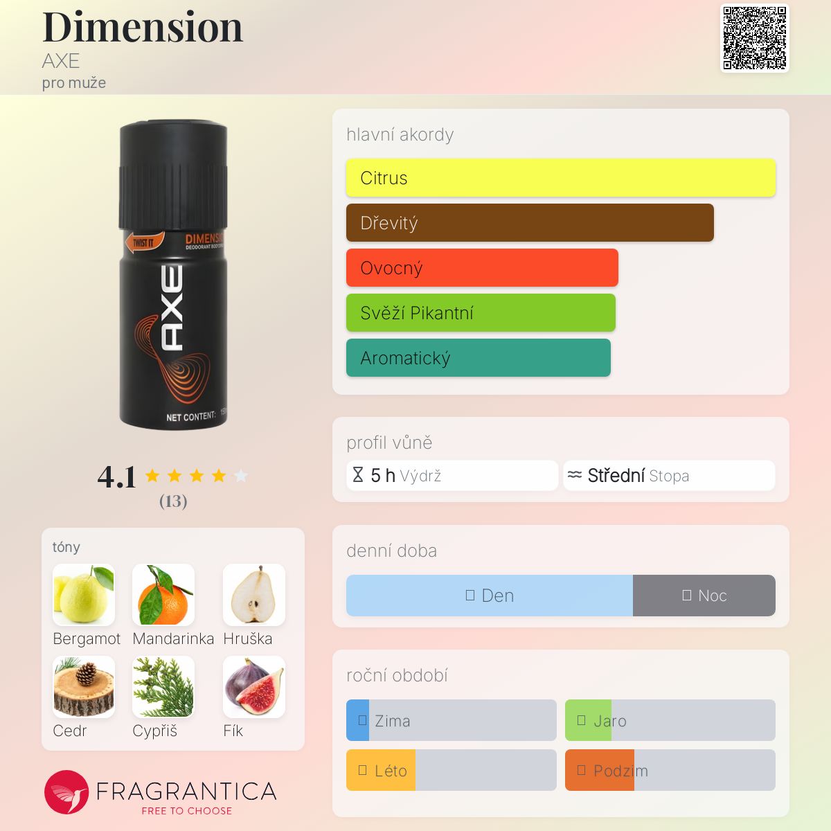 Dimension podle AXE je Woody Aromatic vůně pro muže. Dimension byl/a uveden/a v roce 2002. "Nosem" za touto vůní je Ann Gottlieb. Vrchní tóny jsou Bergamot, Italská mandarinka a Hruška; střední tóny jsouCedr, Cypřiš a Fík ; základní tóny jsou Santalové dřevo a Dubový mech.