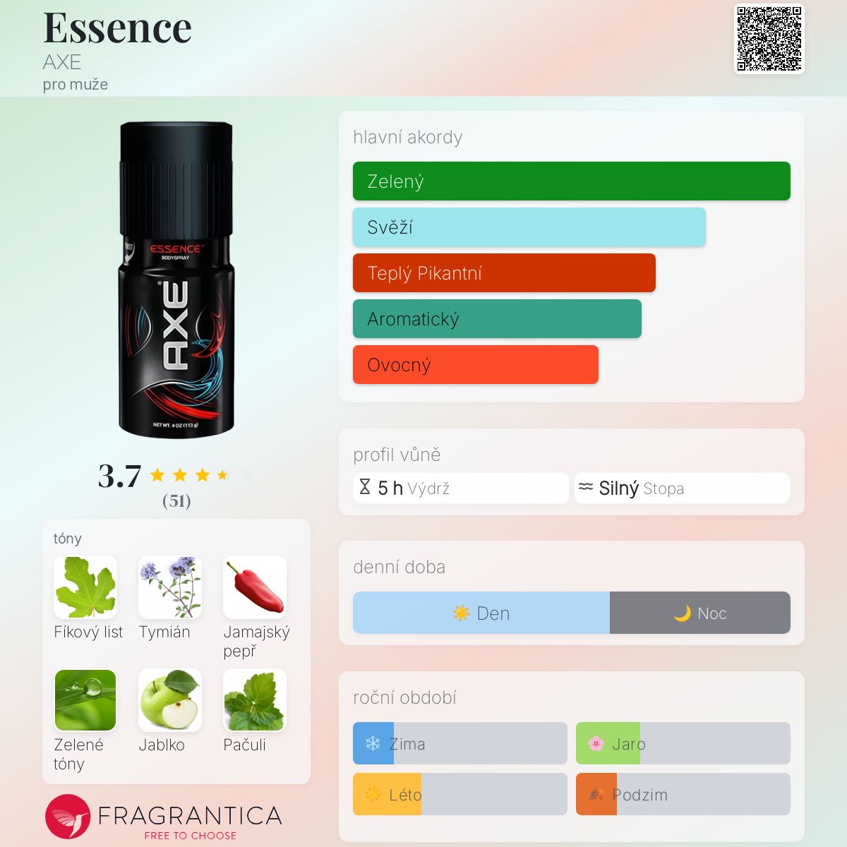 Essence podle AXE je Aromatic Green vůně pro muže. Essence byl/a uveden/a v roce 2000. Vrchní tóny jsou Zelené listí a Zelené jablko; střední tóny jsouFíkový list a Tymián ; základní tóny jsou Jamajský pepř a Pačuli.