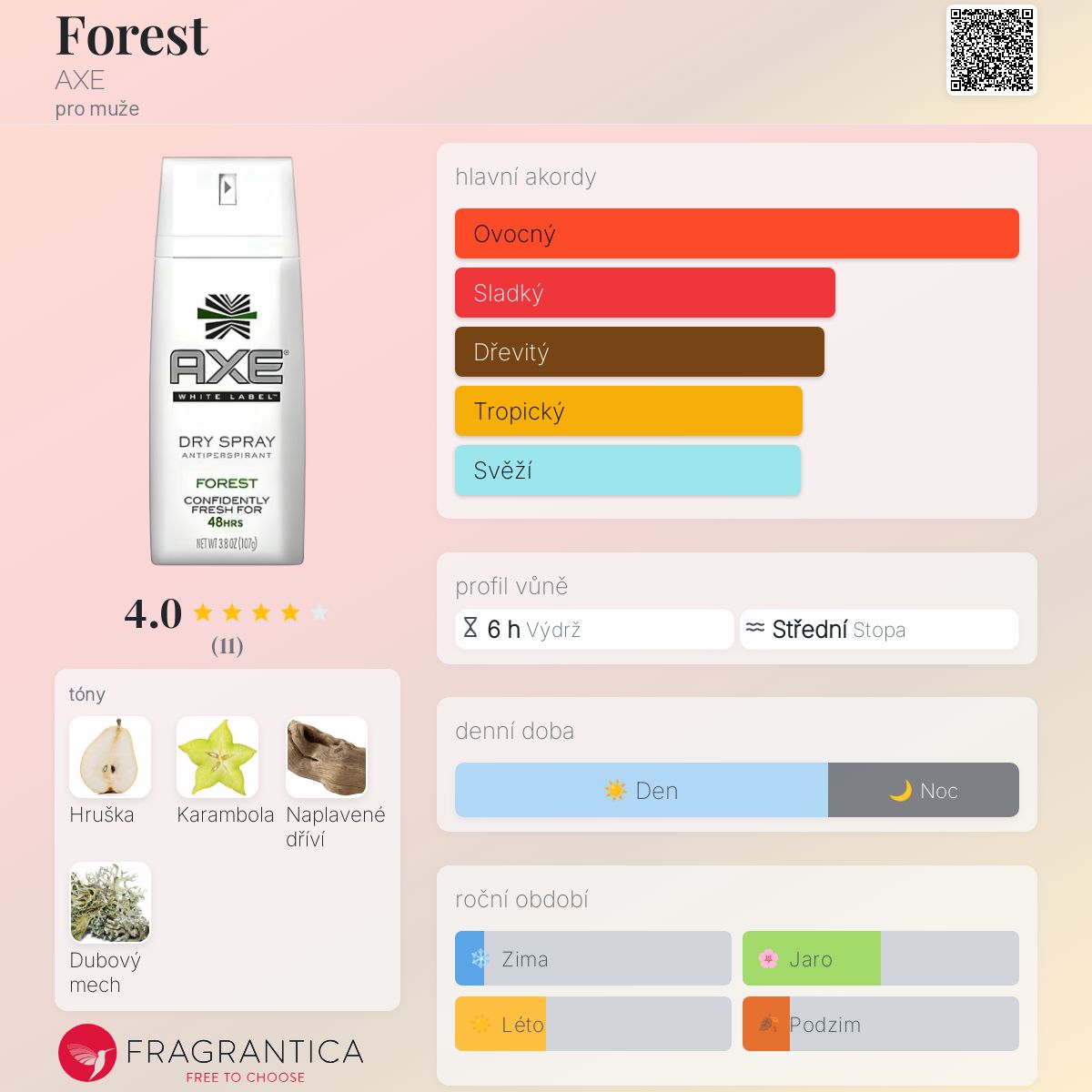 Forest podle AXE je Woody vůně pro muže. Forest byl/a uveden/a v roce 2015. Vrchní tón je Hruška ; střední tón jeKarambola ; základní tóny jsou Naplavené dříví a Mech.