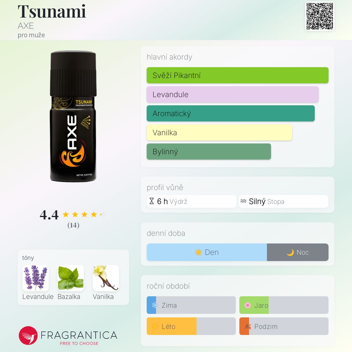 Tsunami podle AXE je Aromatic vůně pro muže. Tsunami byl/a uveden/a v roce 2002. "Nosem" za touto vůní je Ann Gottlieb. Vrchní tón je Bazalka ; střední tón jeLevandule ; základní tón je Vanilka.