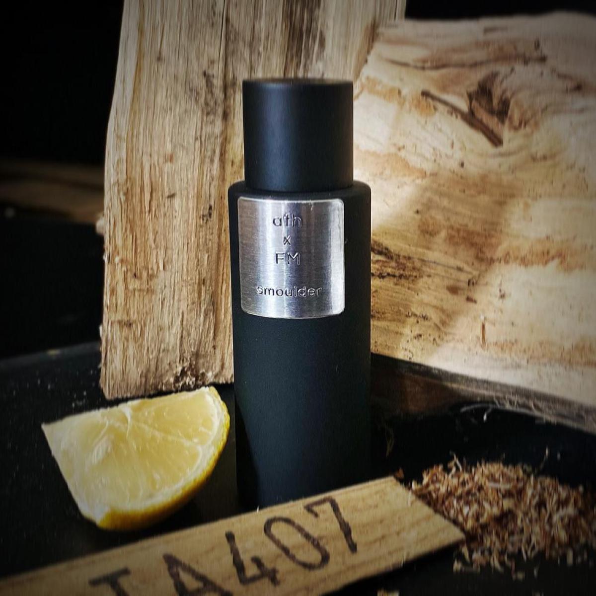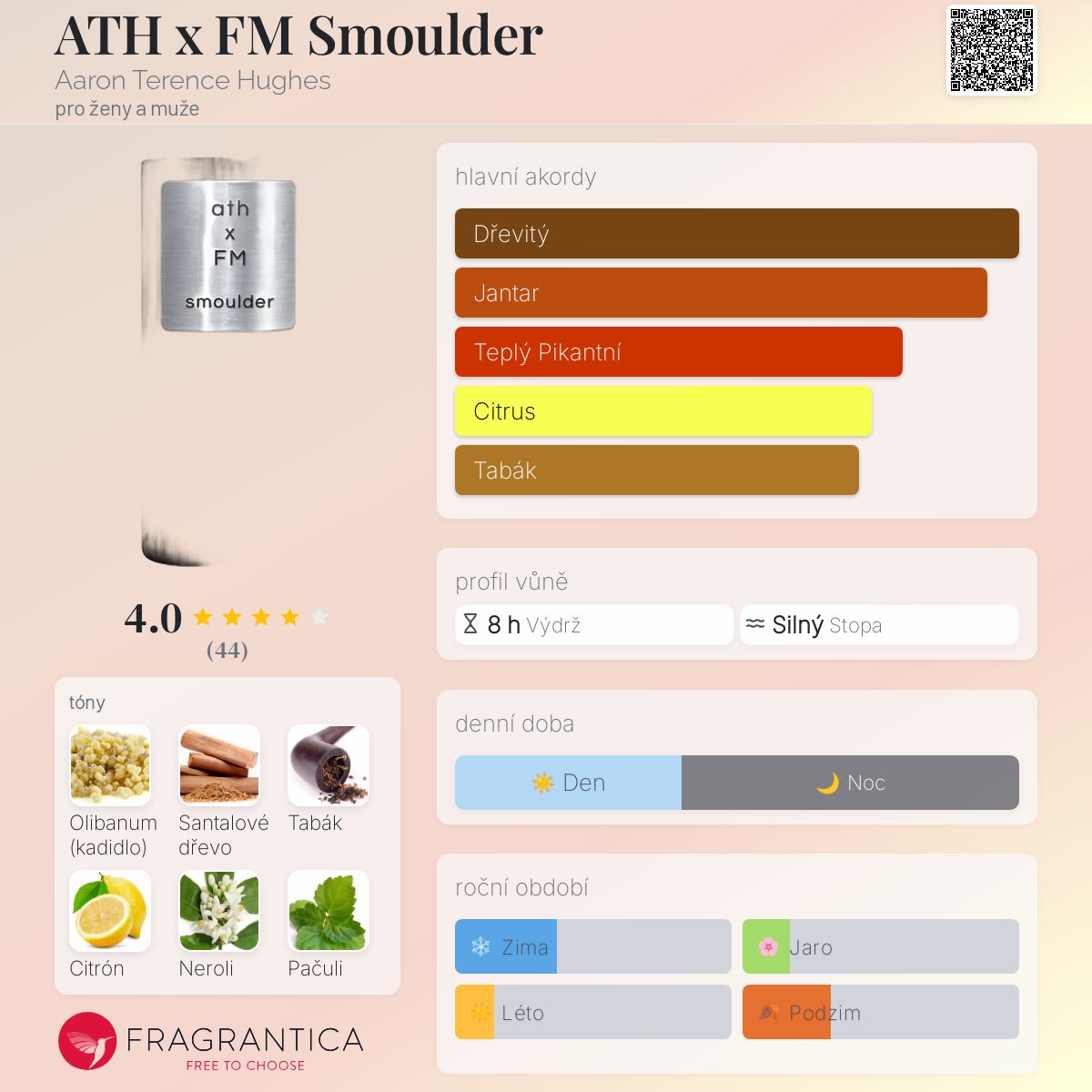 ATH x FM Smoulder podle Aaron Terence Hughes je Woody vůně pro ženy a muže. ATH x FM Smoulder byl/a uveden/a v roce 2021. "Nosem" za touto vůní je Aaron Terence Hughes. Vrchní tóny jsou Citrón a Neroli; střední tóny jsouOlibanum a Tabák ; základní tóny jsou Olibanum, Santalové dřevo, Pačuli a Kůže.