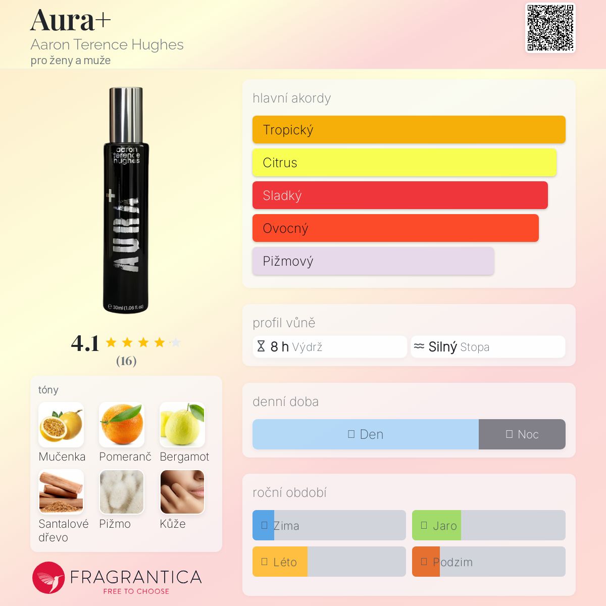 Aura+ podle Aaron Terence Hughes je Floral Fruity vůně pro ženy a muže. Toto je nová vůně. Aura+ byl/a uveden/a v roce 2025. Vrchní tóny jsou Sladký pomeranč a Bergamot; střední tón jeMučenka ; základní tóny jsou Santalové dřevo, Bílé pižmo a Kůže.