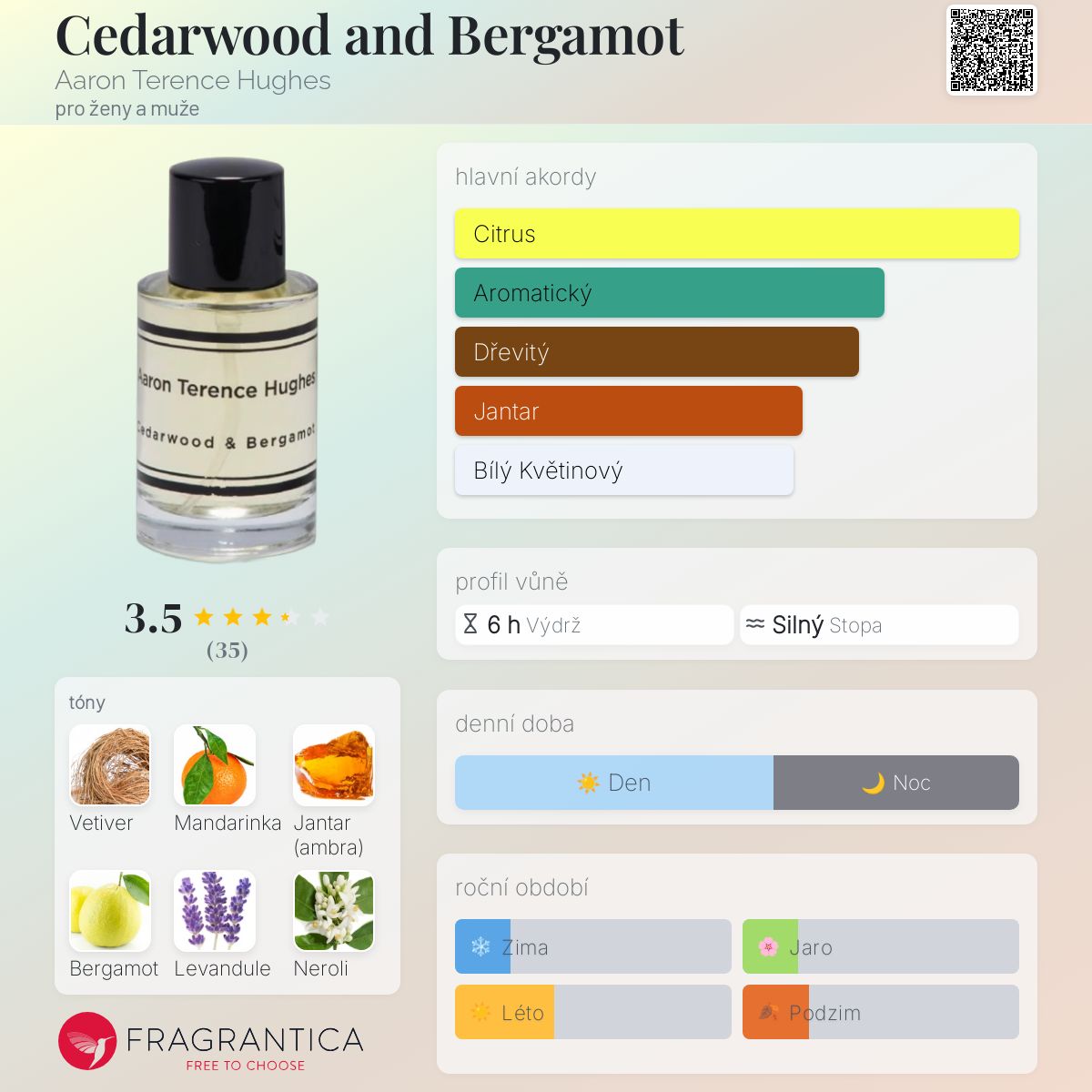 Cedarwood and Bergamot podle Aaron Terence Hughes je Woody vůně pro ženy a muže. Cedarwood and Bergamot byl/a uveden/a v roce 2019. "Nosem" za touto vůní je Aaron Terence Hughes. Vrchní tóny jsou Mandarinka, Bergamot, Levandule, Neroli a Sicilský citron; střední tóny jsouVetiver a Jasmín Sambac ; základní tóny jsou Jantar (ambra) a Cedr.