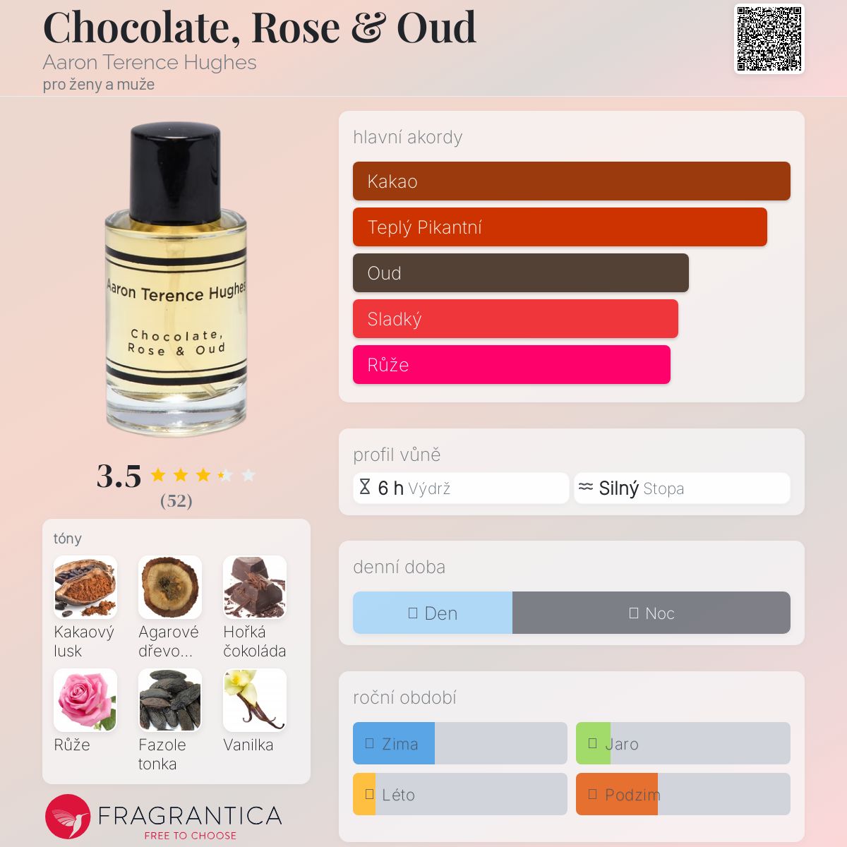 Chocolate, Rose & Oud podle Aaron Terence Hughes je Orientální Vanilla vůně pro ženy a muže. Chocolate, Rose & Oud byl/a uveden/a v roce 2019. "Nosem" za touto vůní je Aaron Terence Hughes. Vrchní tón je Turecká růže ; střední tóny jsouKakaový lusk, Fazole tonka a Madagaskarská vanilka ; základní tóny jsou Agarové dřevo (oud), Hořká čokoláda, Pačuli a Santalové dřevo.