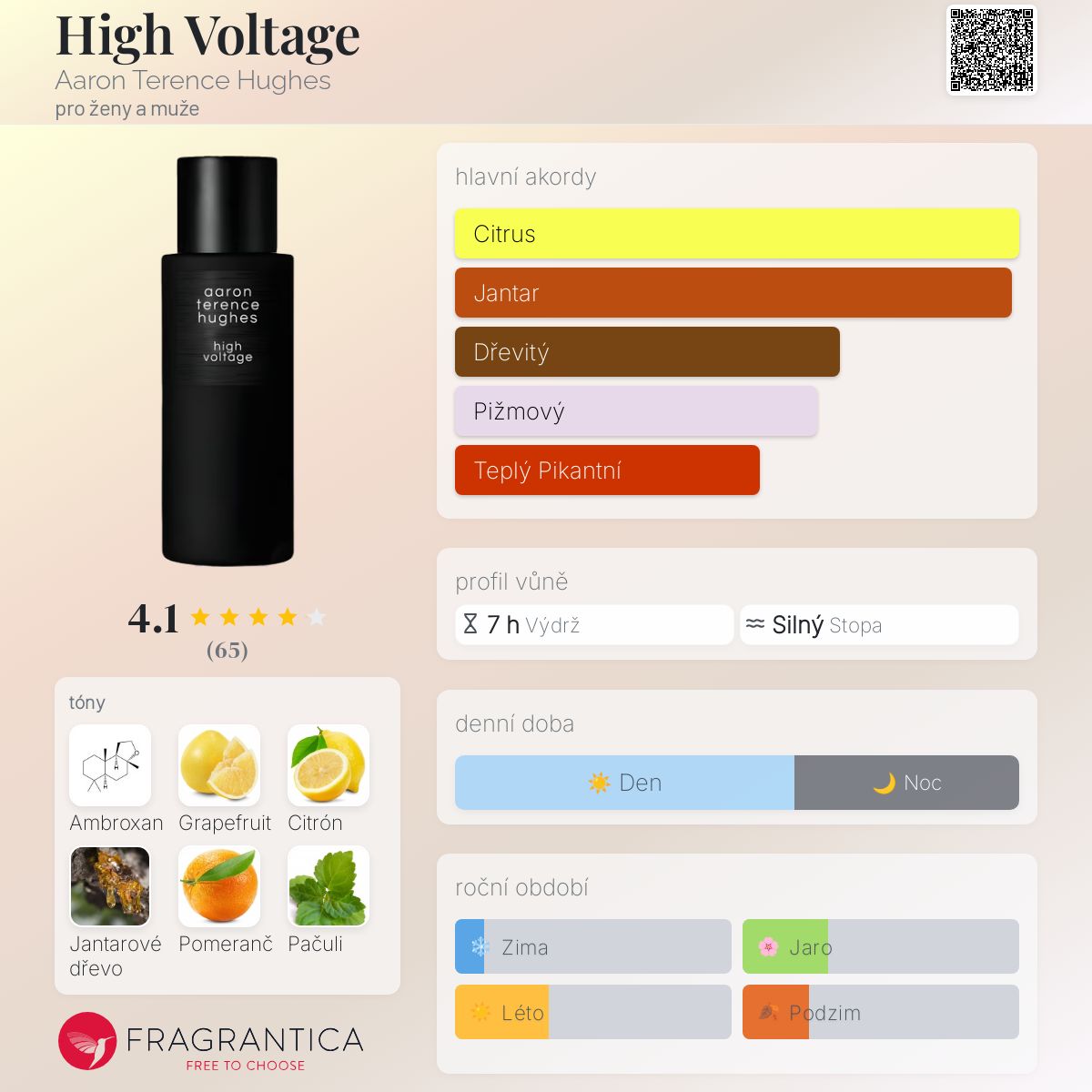 High Voltage podle Aaron Terence Hughes je Citrus vůně pro ženy a muže. High Voltage byl/a uveden/a v roce 2022. "Nosem" za touto vůní je Aaron Terence Hughes. Vrchní tóny jsou Grapefruit, Citrón a Pomeranč; střední tóny jsouAmbroxan a Jantarové dřevo ; základní tóny jsou Pačuli a Santalové dřevo.