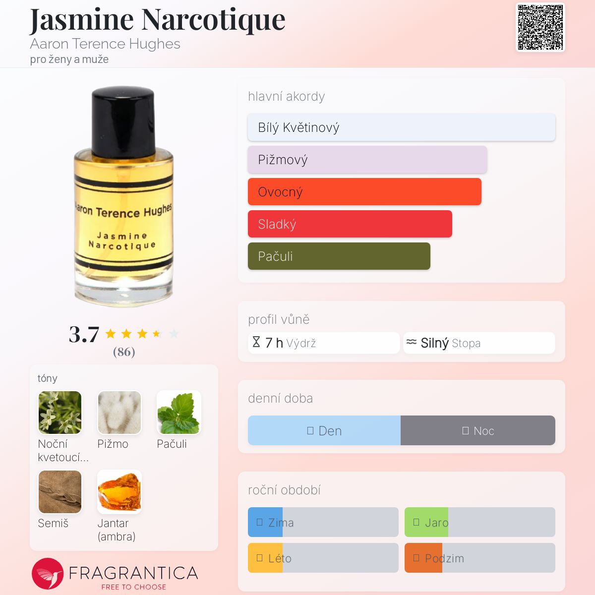 Jasmine Narcotique podle Aaron Terence Hughes je vůně pro ženy a muže. Jasmine Narcotique byl/a uveden/a v roce 2019. "Nosem" za touto vůní je Aaron Terence Hughes. Vrchní tón je Noční kvetoucí jasmín ; střední tón jeSemiš ; základní tóny jsou Pižmo, Pačuli a Jantar (ambra).