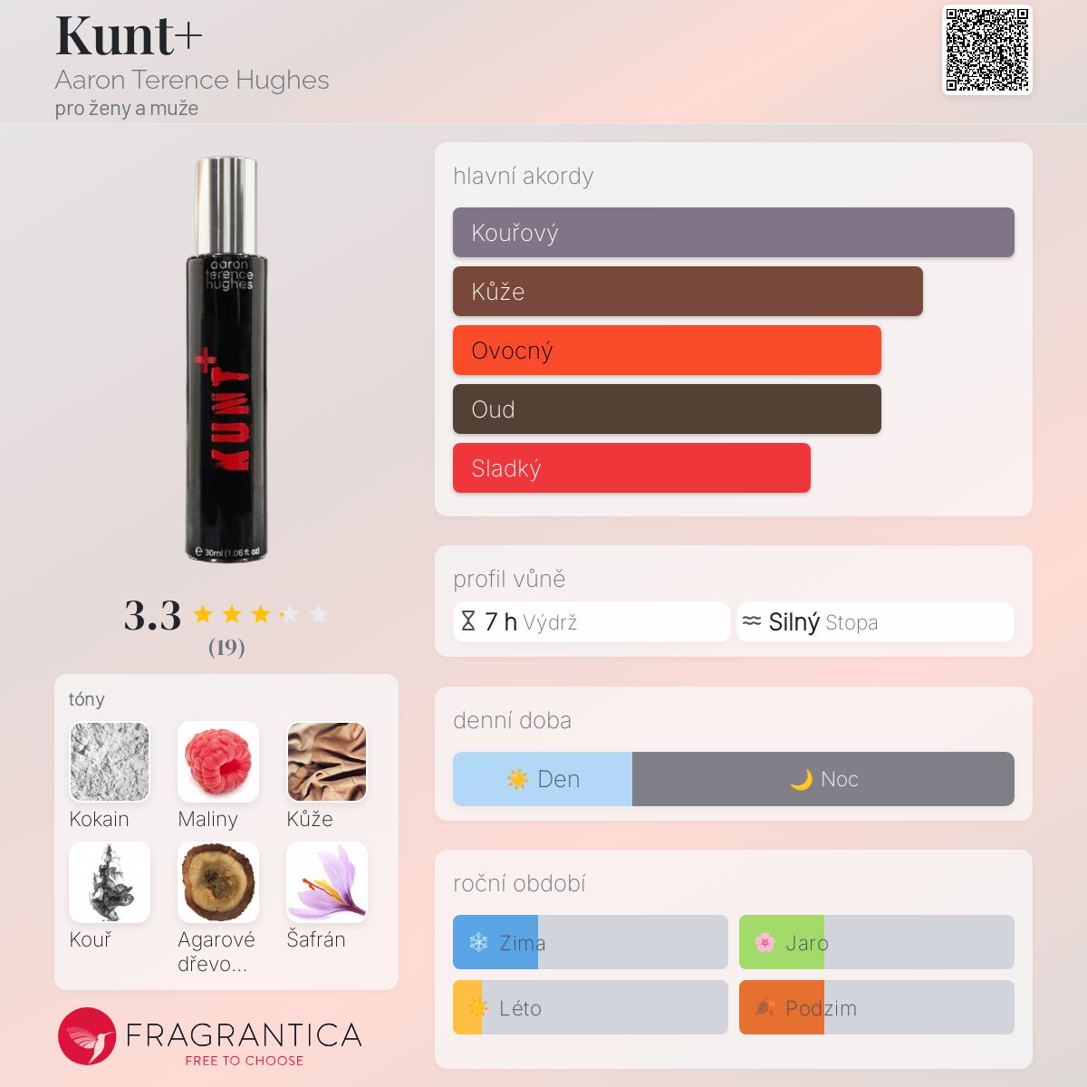 Kunt+ podle Aaron Terence Hughes je Leather vůně pro ženy a muže. Toto je nová vůně. Kunt+ byl/a uveden/a v roce 2024. "Nosem" za touto vůní je Aaron Terence Hughes. Vrchní tóny jsou Maliny a Šafrán; střední tóny jsouJasmín a Kosatec ; základní tóny jsou Kokain, Kůže, Kouř, Agarové dřevo (oud), Kadidlo, Tabák, Kadidlo, Pačuli, Ambra, Cedr a Pižmo.