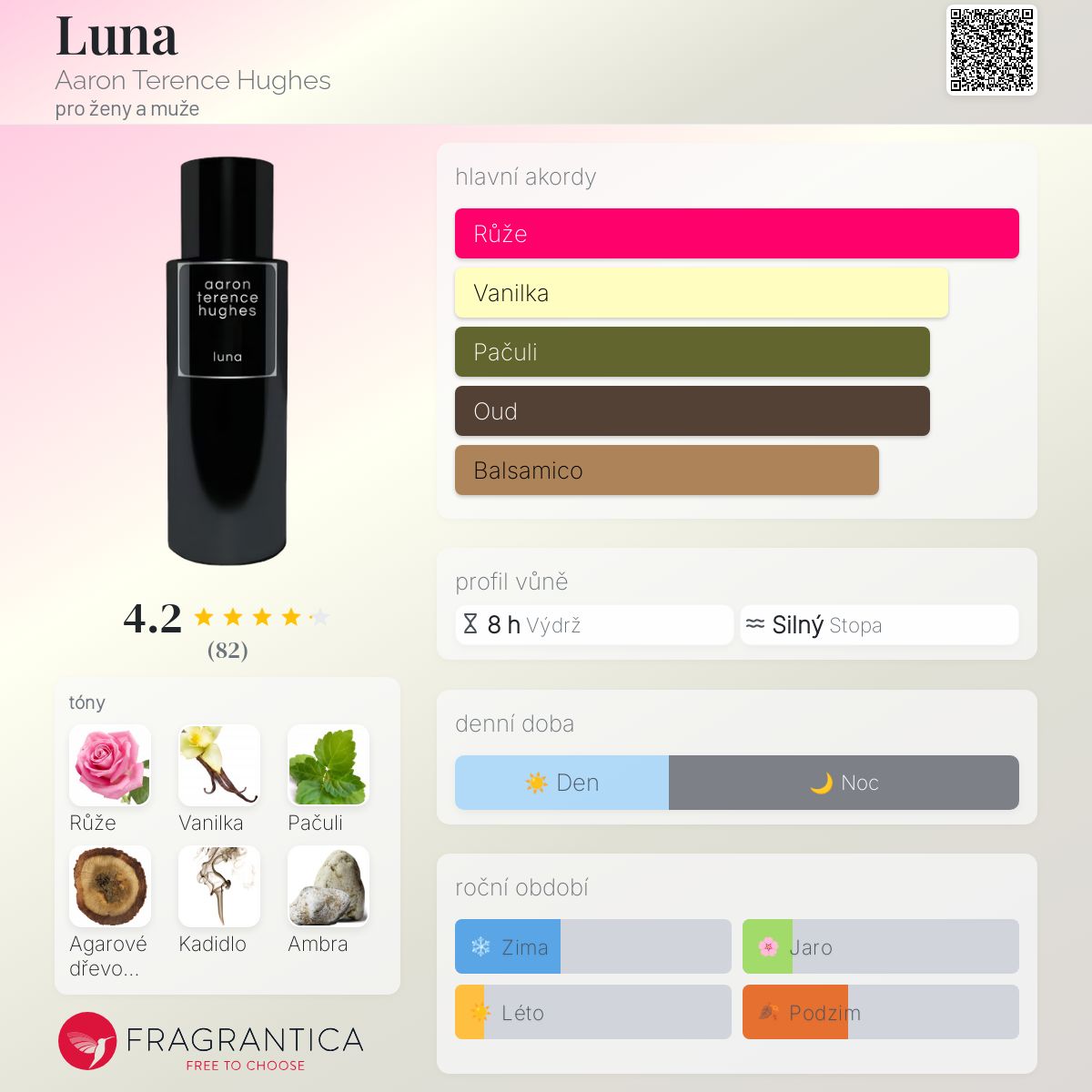 Luna podle Aaron Terence Hughes je vůně pro ženy a muže. Luna byl/a uveden/a v roce 2023. Vrchní tón je Růže ; střední tóny jsouTahitská vanilka a Kadidlo ; základní tóny jsou Pačuli, Agarové dřevo (oud), Ambra a Pižmo.