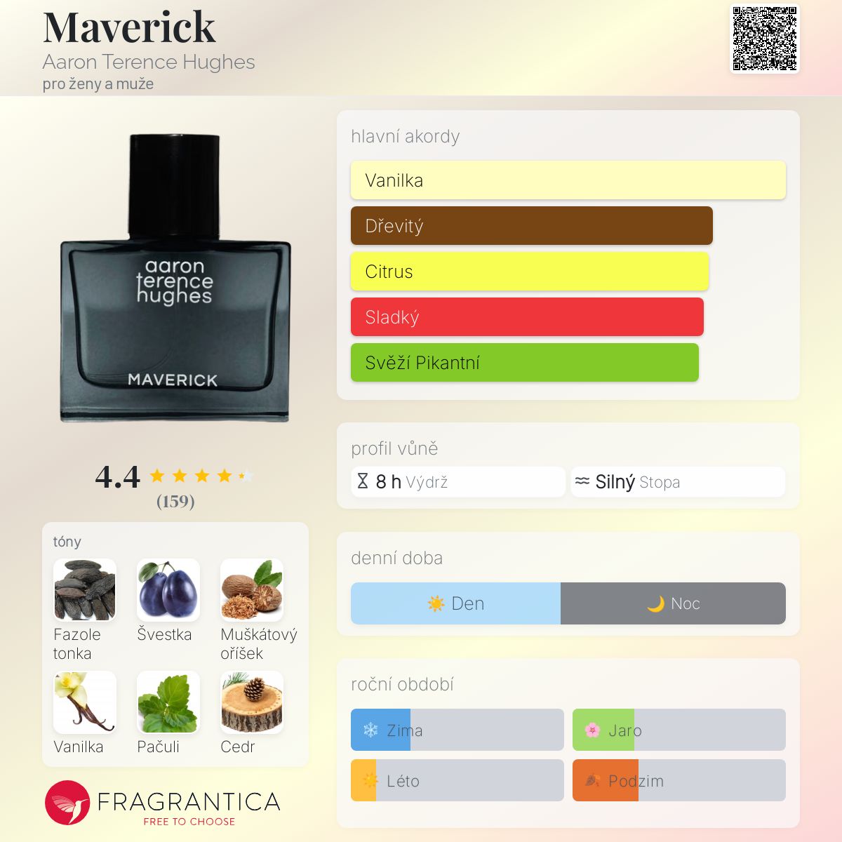 Maverick podle Aaron Terence Hughes je Aromatic Spicy vůně pro ženy a muže. Maverick byl/a uveden/a v roce 2021. "Nosem" za touto vůní je Aaron Terence Hughes. Vrchní tóny jsou Citrón, Bergamot a Mandarinka; střední tóny jsouFazole tonka, Švestka a Vanilka ; základní tóny jsou Muškátový oříšek, Pačuli a Cedr.