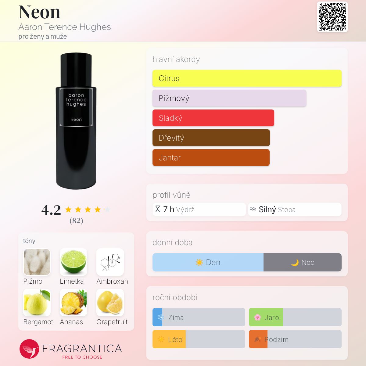 Neon podle Aaron Terence Hughes je vůně pro ženy a muže. Neon byl/a uveden/a v roce 2023. Vrchní tóny jsou Limetka, Bergamot, Grapefruit, Sladký pomeranč a Růžový pepř; střední tóny jsouAmbroxan, Ananas a Galbanum ; základní tóny jsou Bílé pižmo, Santalové dřevo, Pačuli a Vetiver.