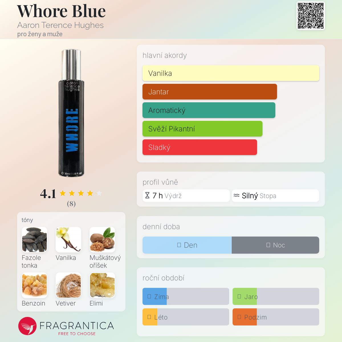 Whore Blue podle Aaron Terence Hughes je Orientální Woody vůně pro ženy a muže. Toto je nová vůně. Whore Blue byl/a uveden/a v roce 2025. "Nosem" za touto vůní je Aaron Terence Hughes. Vrchní tóny jsou Muškátový oříšek, Bergamot a Pryskyřice elimi; střední tón jeTabák ; základní tóny jsou Vanilka, Fazole tonka, Bílé pižmo, Pačuli, Benzoin a Vetiver.