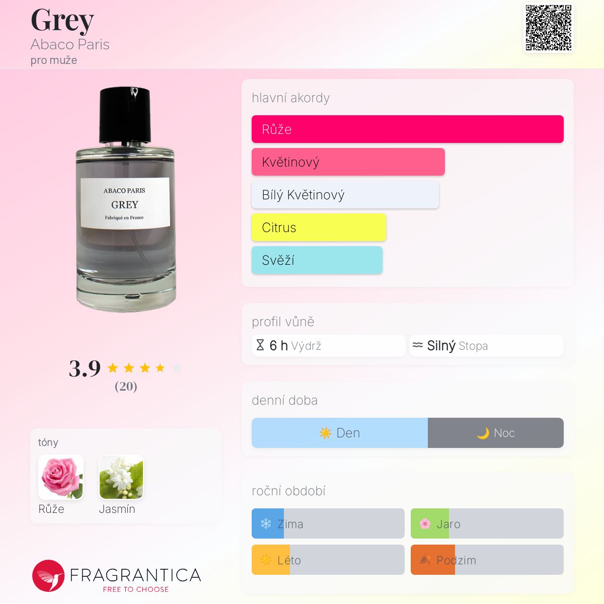 Grey podle Abaco Paris je Floral vůně pro muže. Grey byl/a uveden/a v roce 2020. "Nosem" za touto vůní je Nejla Barbir.