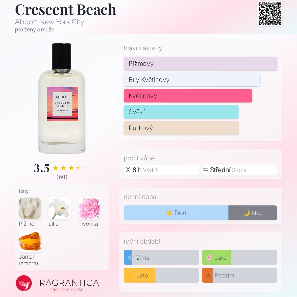 Crescent Beach podle Abbott New York City je Orientální Floral vůně pro ženy a muže. Crescent Beach byl/a uveden/a v roce 2022. Vrchní tón je Pivoňka ; střední tón jeLilie ; základní tóny jsou Pižmo a Jantar (ambra).
