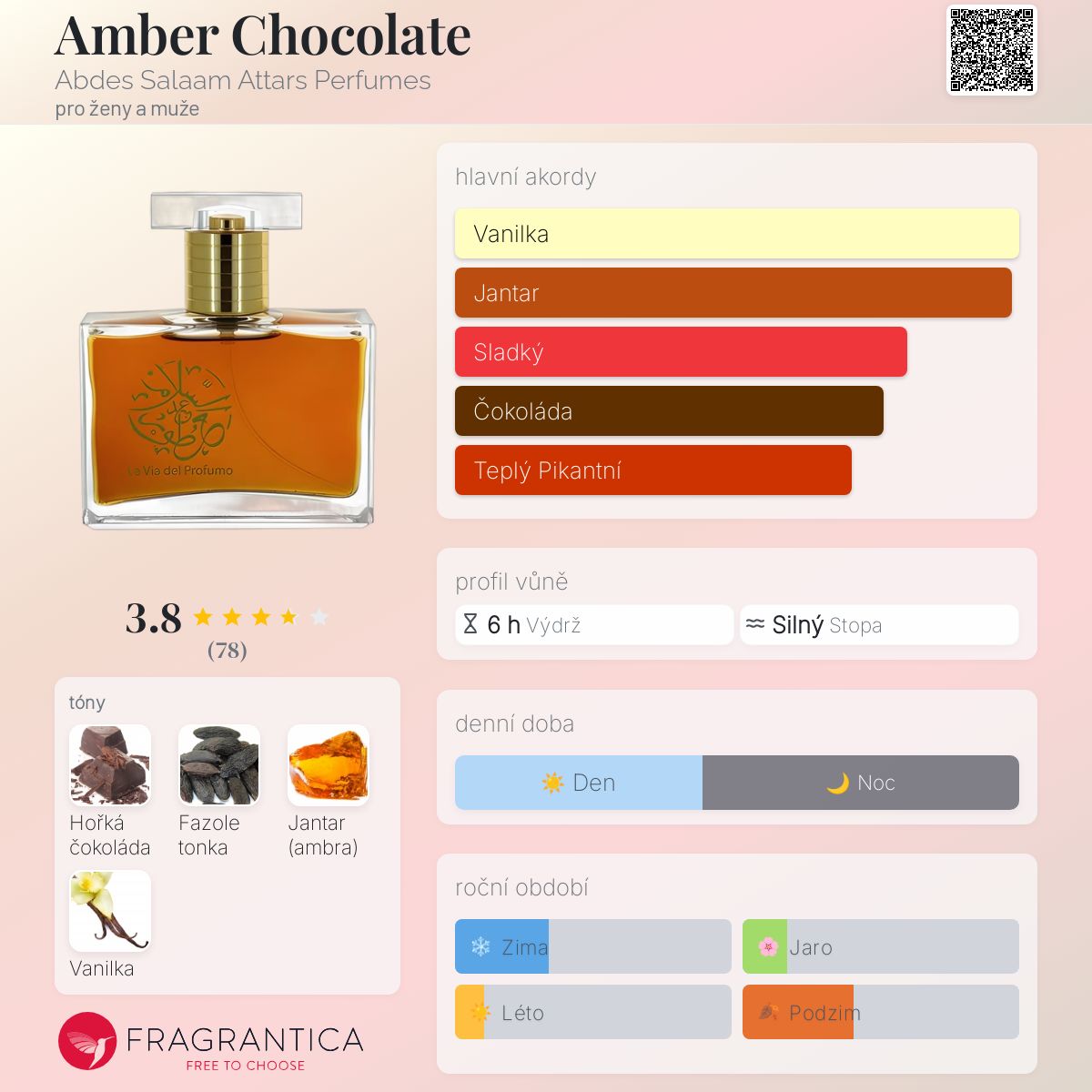 Amber Chocolate podle Abdes Salaam Attars Perfumes je Orientální Vanilla vůně pro ženy a muže. Amber Chocolate byl/a uveden/a v roce 2016. "Nosem" za touto vůní je Dominique Dubrana.
