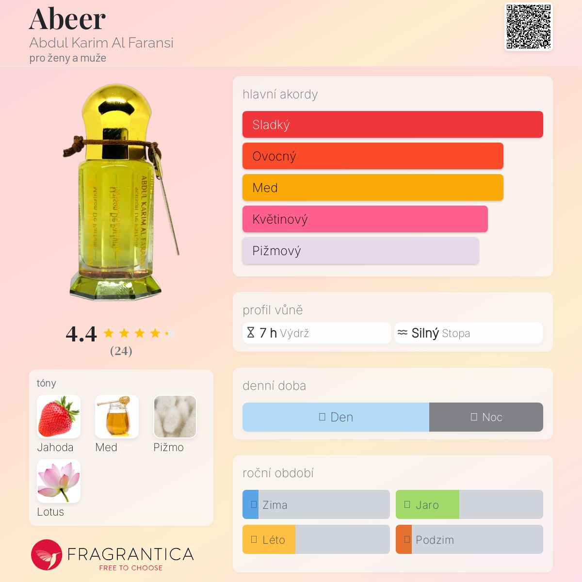 Abeer podle Abdul Karim Al Faransi je Aromatic Fruity vůně pro ženy a muže. Abeer byl/a uveden/a v roce 2018. "Nosem" za touto vůní je Anthony Abdul Karim Marmin.