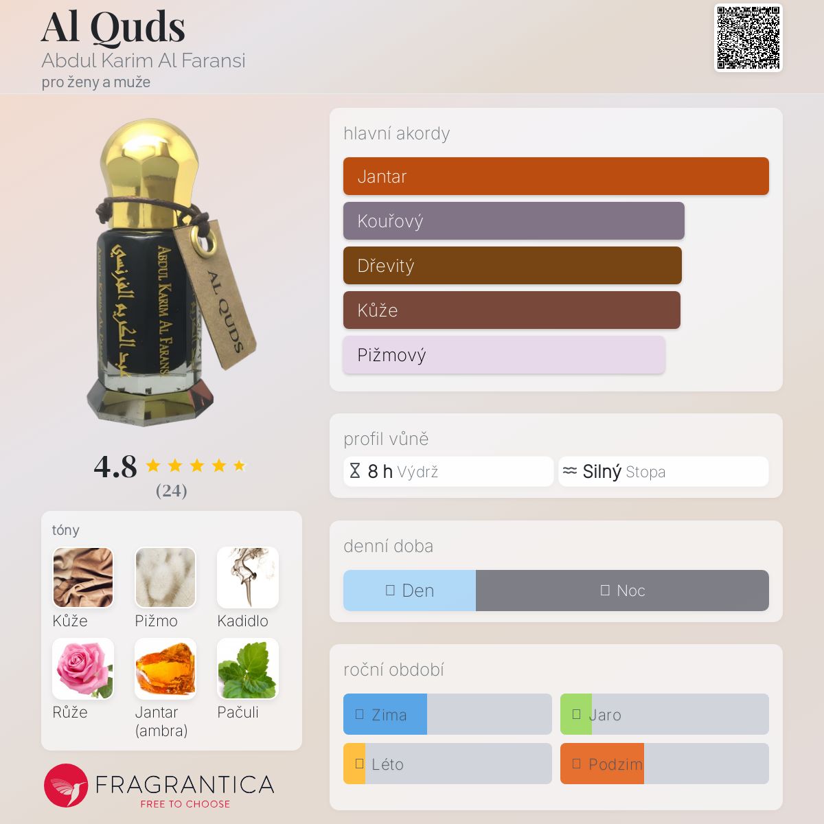Al Quds podle Abdul Karim Al Faransi je Orientální vůně pro ženy a muže. Al Quds byl/a uveden/a v roce 2016. "Nosem" za touto vůní je Anthony Abdul Karim Marmin. Vrchní tóny jsou Kůže a Černé pižmo; střední tóny jsouKadidlo, Růže a Pačuli ; základní tóny jsou Jantar (ambra) a Dřevité tóny.