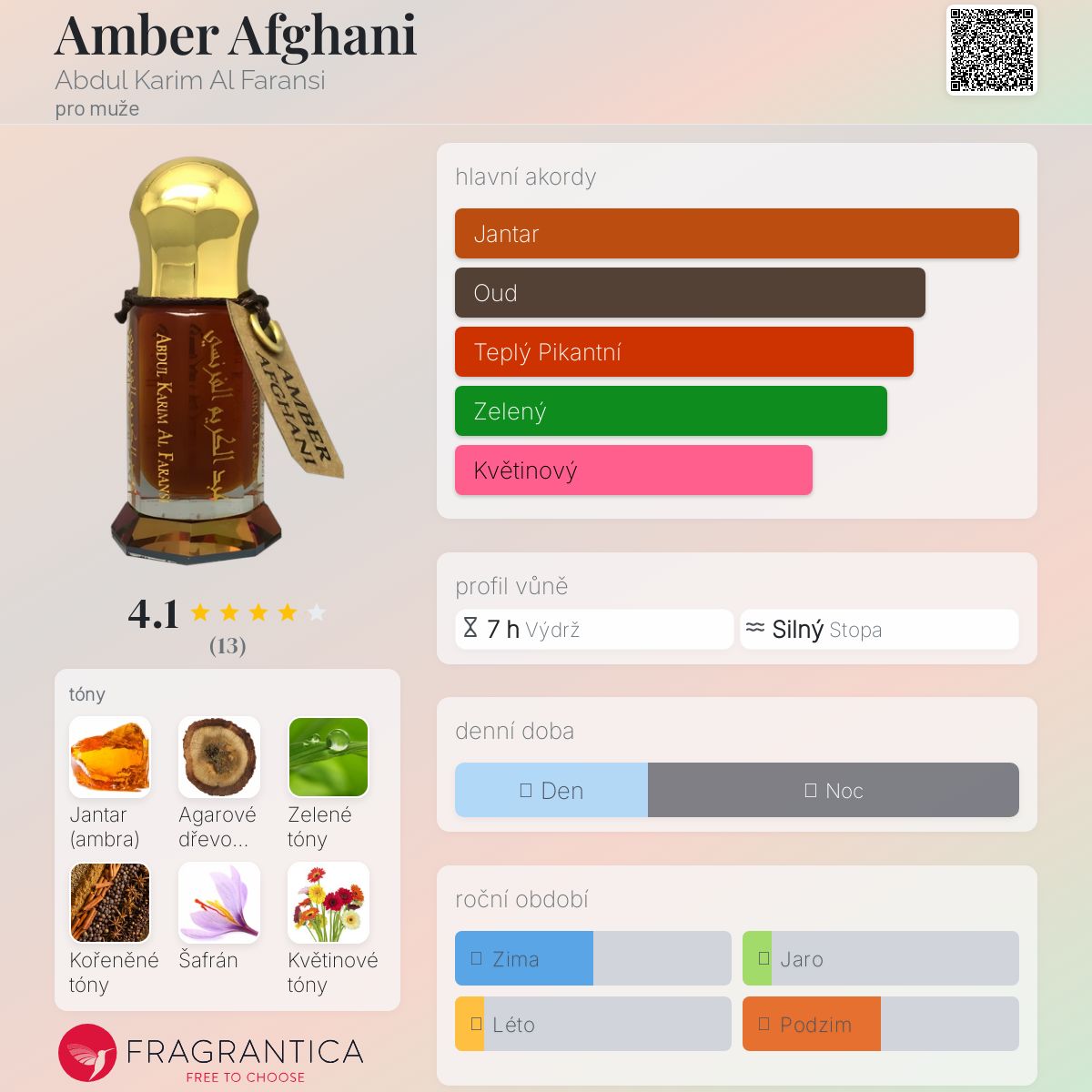 Amber Afghani podle Abdul Karim Al Faransi je Woody Aromatic vůně pro muže. Amber Afghani byl/a uveden/a v roce 2014. "Nosem" za touto vůní je Anthony Abdul Karim Marmin. Vrchní tóny jsou Jantar (ambra) a Květinové tóny; střední tóny jsouBylinné tóny, Koření a Šafrán ; základní tóny jsou Jantar (ambra) a Agarové dřevo (oud).