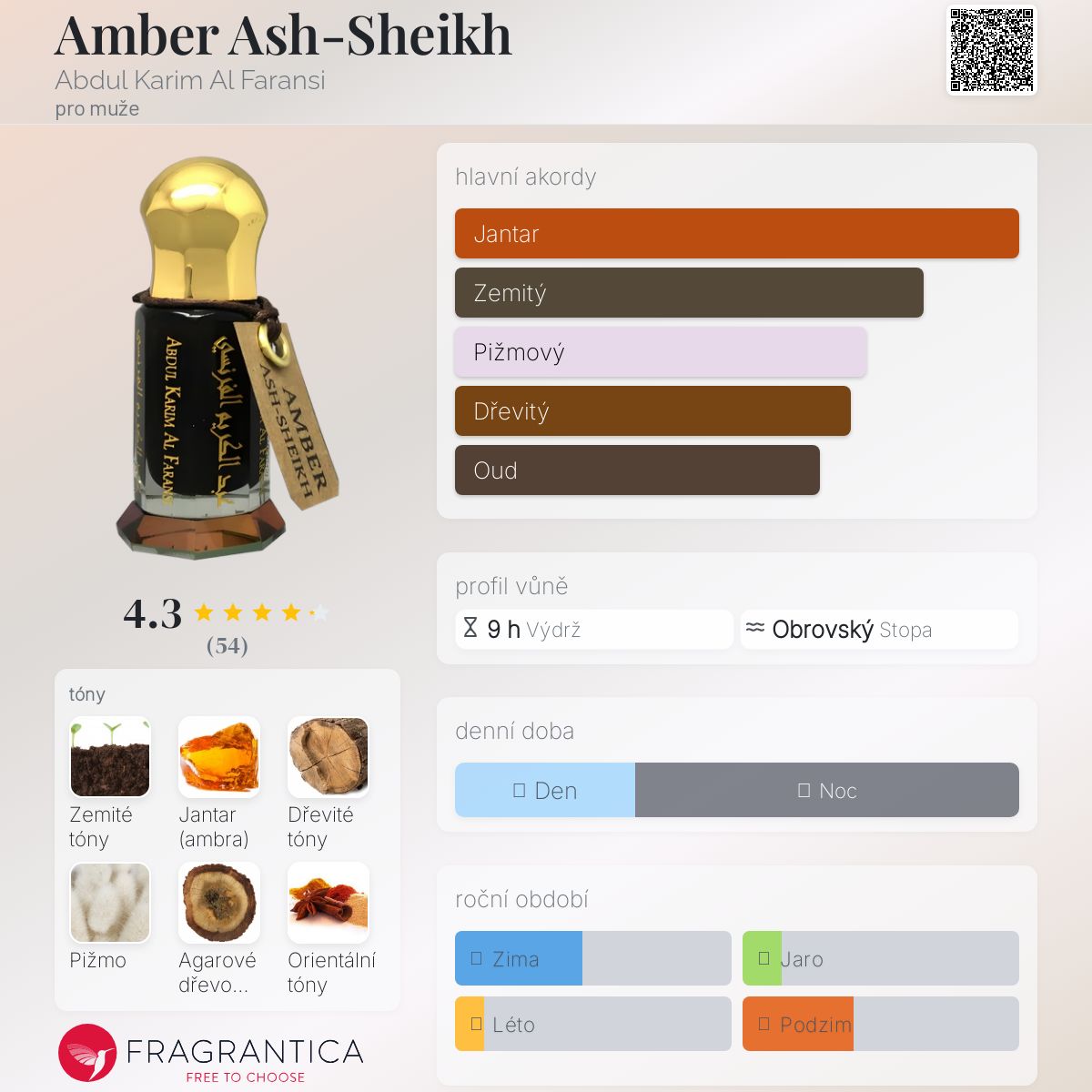 Amber Ash-Sheikh podle Abdul Karim Al Faransi je Orientální vůně pro muže. Amber Ash-Sheikh byl/a uveden/a v roce 2014. "Nosem" za touto vůní je Anthony Abdul Karim Marmin. Vrchní tóny jsou Zemité tóny a Jantar (ambra); střední tóny jsouDřevité tóny, Pižmo a Orientální tóny ; základní tóny jsou Jantar (ambra) a Agarové dřevo (oud).