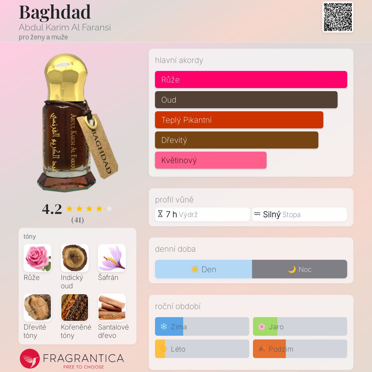 Baghdad podle Abdul Karim Al Faransi je Orientální Woody vůně pro ženy a muže. Baghdad byl/a uveden/a v roce 2014. "Nosem" za touto vůní je Anthony Abdul Karim Marmin. Vrchní tóny jsou Růže a Koření; střední tóny jsouŠafrán, Dřevité tóny a Sladké tóny ; základní tóny jsou Indický oud a Santalové dřevo.