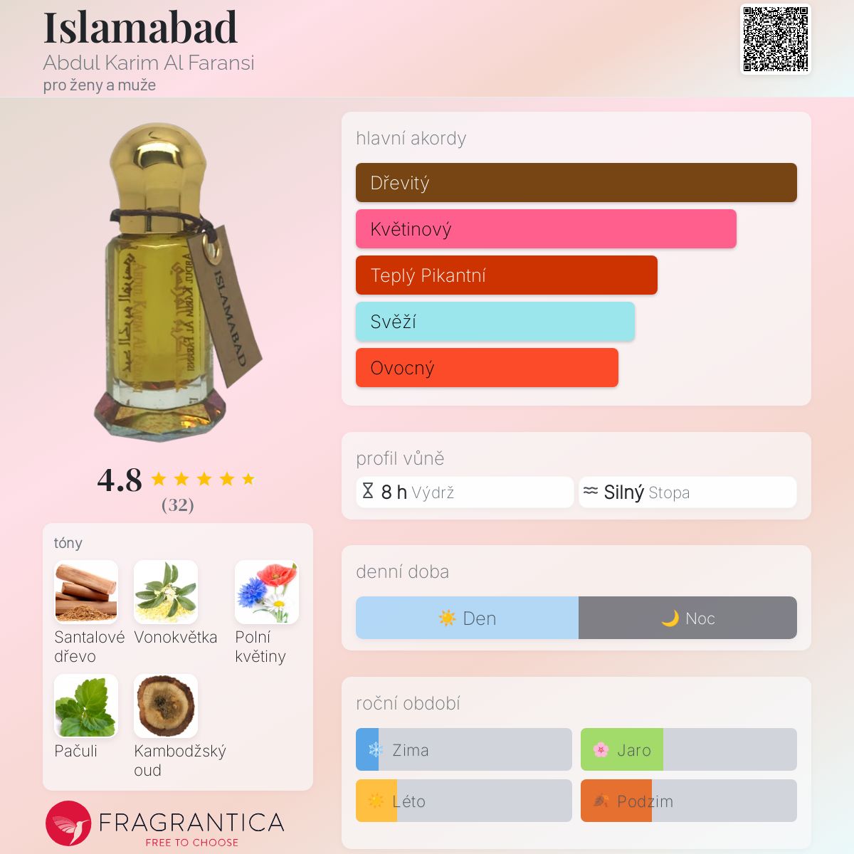 Islamabad podle Abdul Karim Al Faransi je vůně pro ženy a muže. Islamabad byl/a uveden/a v roce 2017. "Nosem" za touto vůní je Anthony Abdul Karim Marmin.