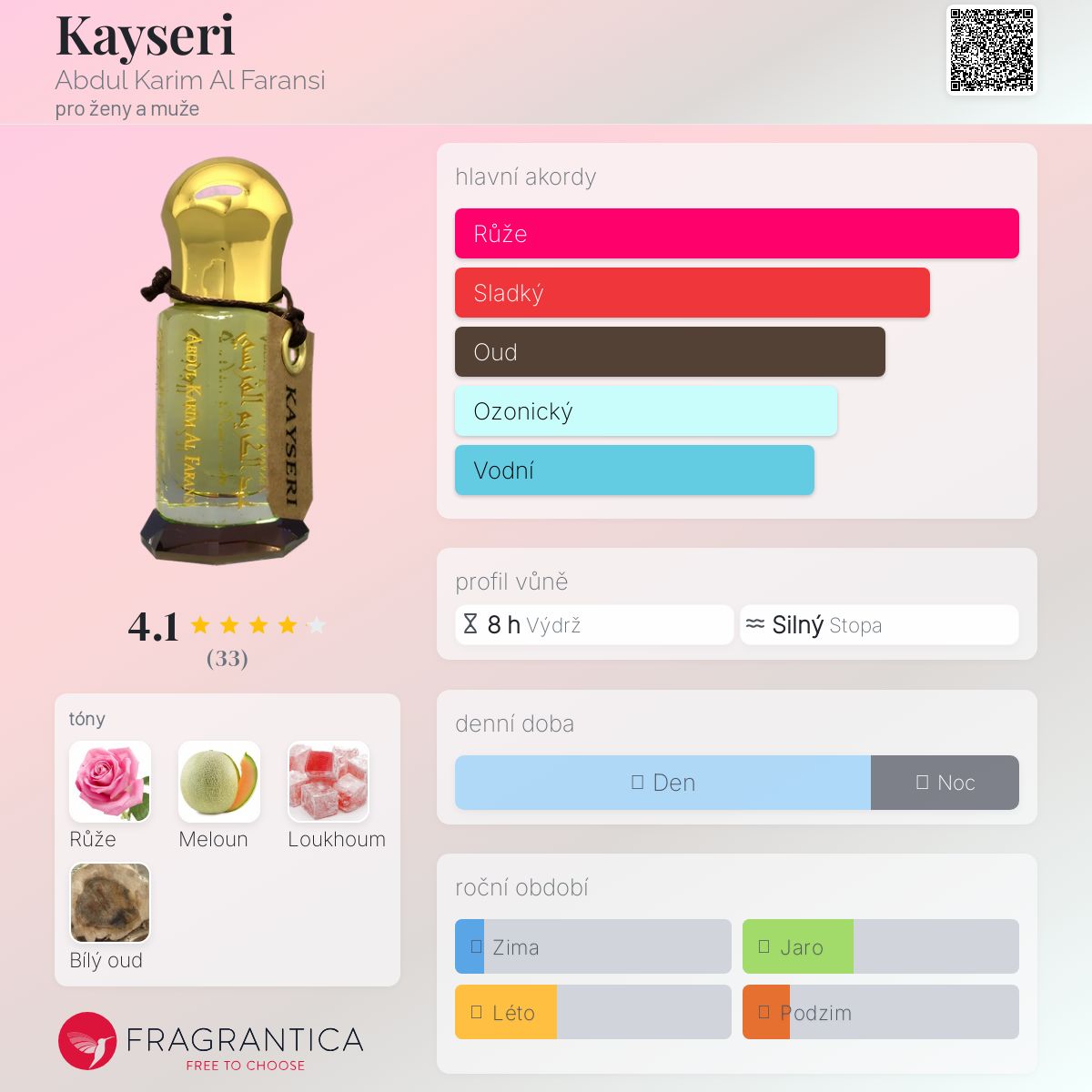 Kayseri podle Abdul Karim Al Faransi je Orientální Vanilla vůně pro ženy a muže. Kayseri byl/a uveden/a v roce 2014. "Nosem" za touto vůní je Anthony Abdul Karim Marmin. Vrchní tón je Meloun ; střední tón jeLoukhoum ; základní tóny jsou Turecká růže a Bílý oud.