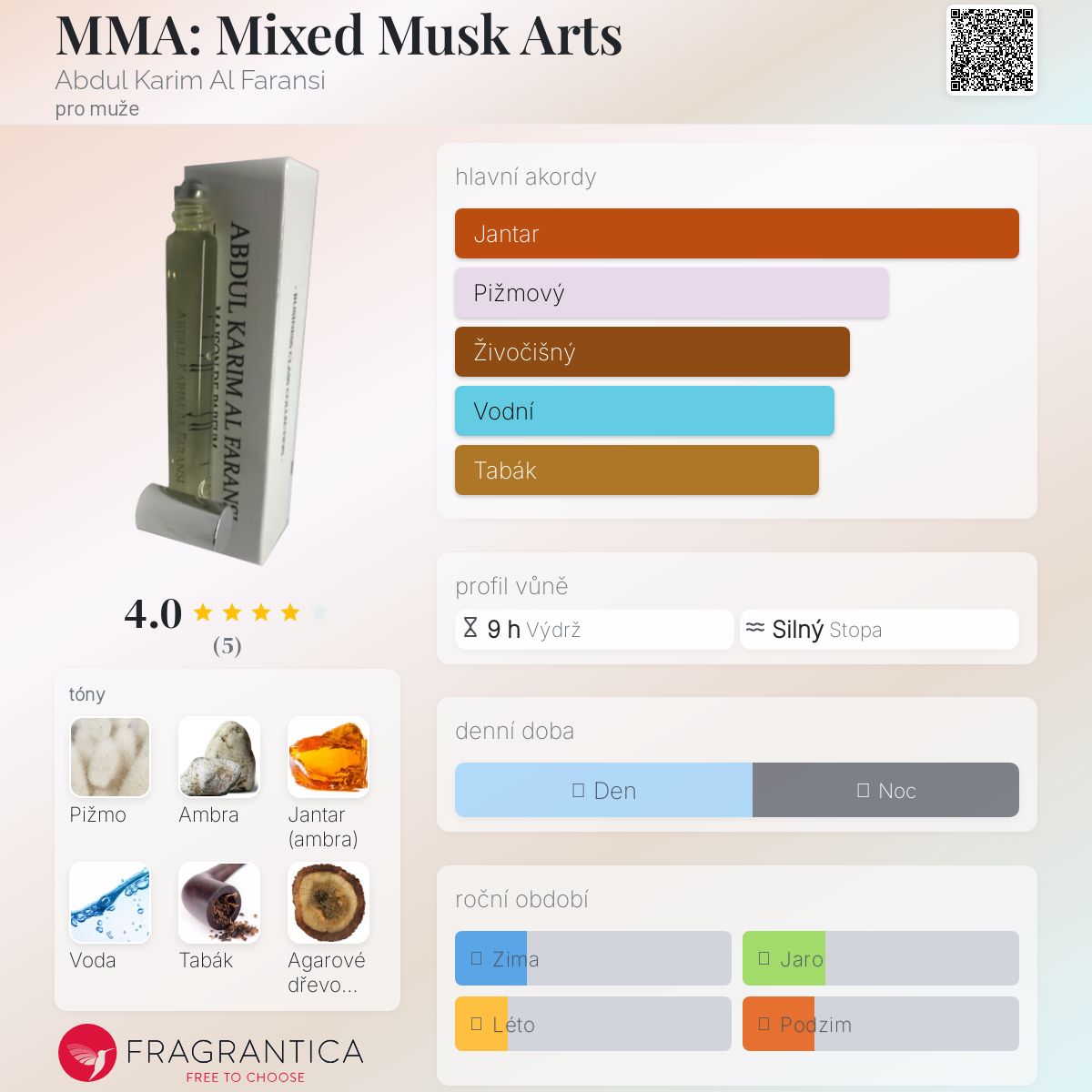 MMA: Mixed Musk Arts podle Abdul Karim Al Faransi je vůně pro muže. MMA: Mixed Musk Arts byl/a uveden/a v roce 2017. "Nosem" za touto vůní je Anthony Abdul Karim Marmin.
