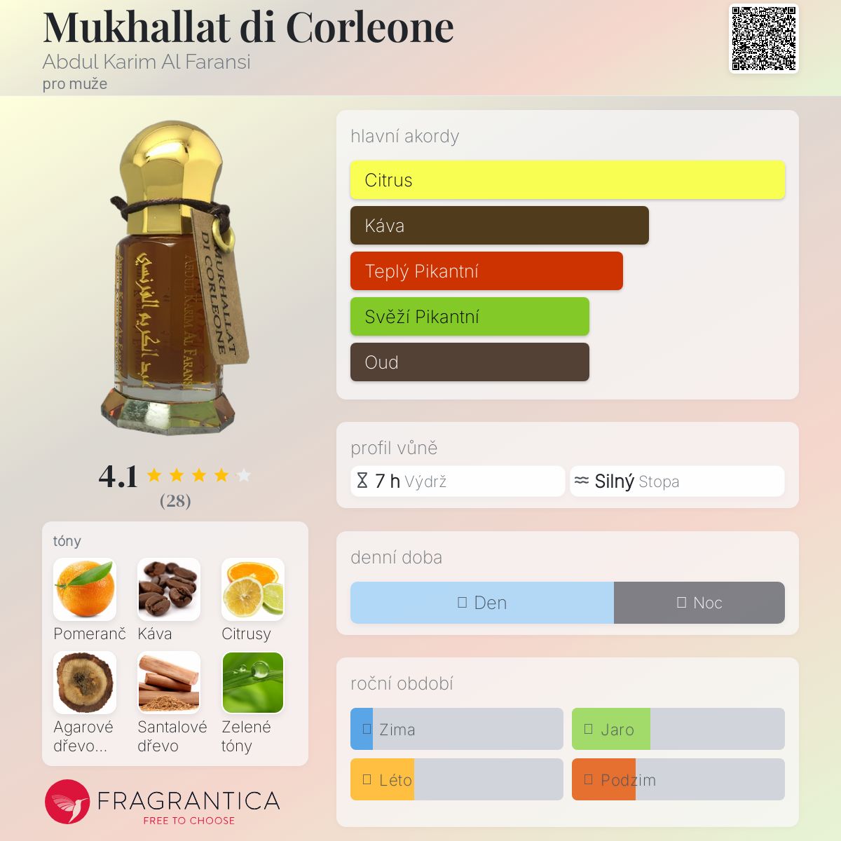 Mukhallat di Corleone podle Abdul Karim Al Faransi je Citrus Gourmand vůně pro muže. Mukhallat di Corleone byl/a uveden/a v roce 2016. "Nosem" za touto vůní je Anthony Abdul Karim Marmin. Vrchní tóny jsou Káva a Citrusy; střední tóny jsouSicilský pomeranč a Bylinné tóny ; základní tóny jsou Agarové dřevo (oud) a Santalové dřevo.