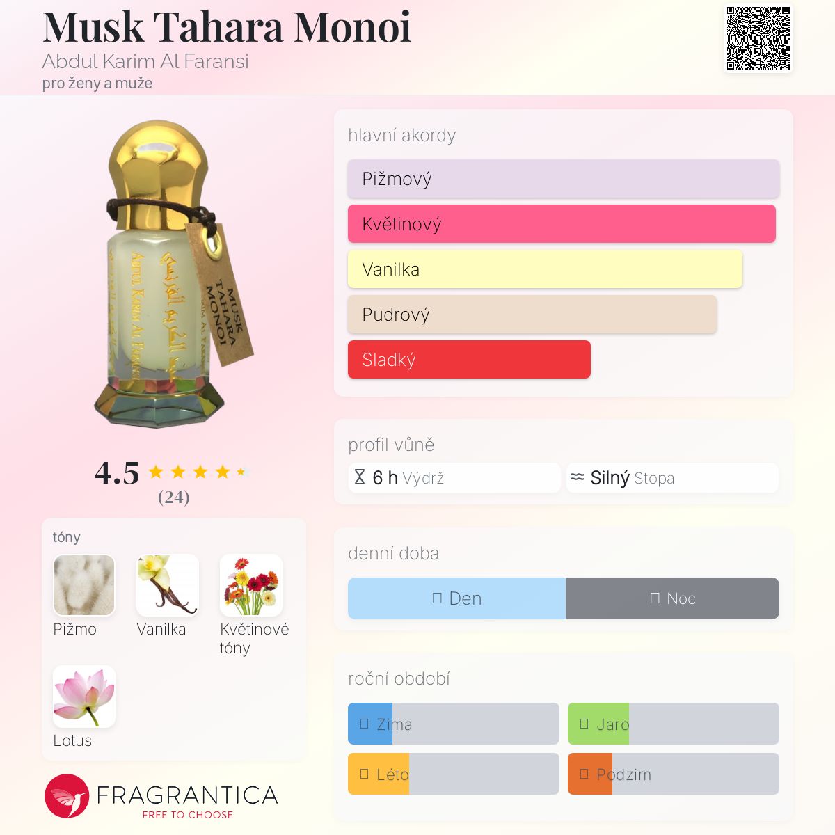 Musk Tahara Monoi podle Abdul Karim Al Faransi je Aromatic vůně pro ženy a muže. Musk Tahara Monoi byl/a uveden/a v roce 2015. "Nosem" za touto vůní je Anthony Abdul Karim Marmin. Vrchní tóny jsou Bílé pižmo a Exotické květinové tóny; střední tóny jsouTahitská vanilka a Bílý lotos ; základní tón je Bílé pižmo.