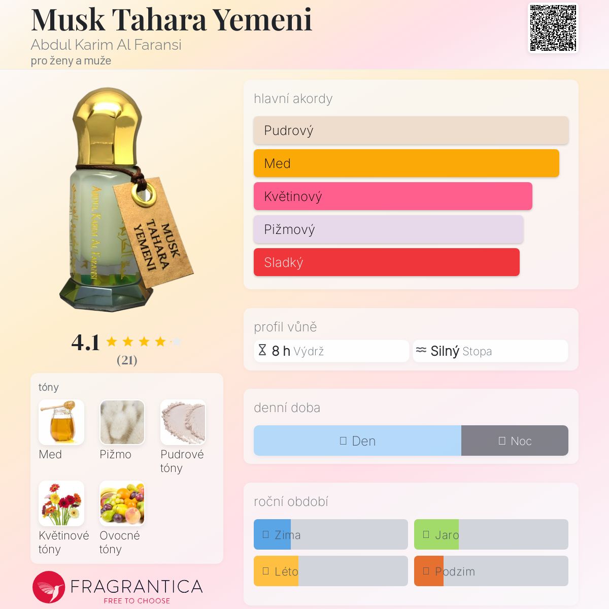 Musk Tahara Yemeni podle Abdul Karim Al Faransi je Orientální Floral vůně pro ženy a muže. Musk Tahara Yemeni byl/a uveden/a v roce 2016. "Nosem" za touto vůní je Anthony Abdul Karim Marmin. Vrchní tóny jsou Med a Ovoce; střední tón jeKvětinové tóny ; základní tóny jsou Bílé pižmo a Pudrové tóny.
