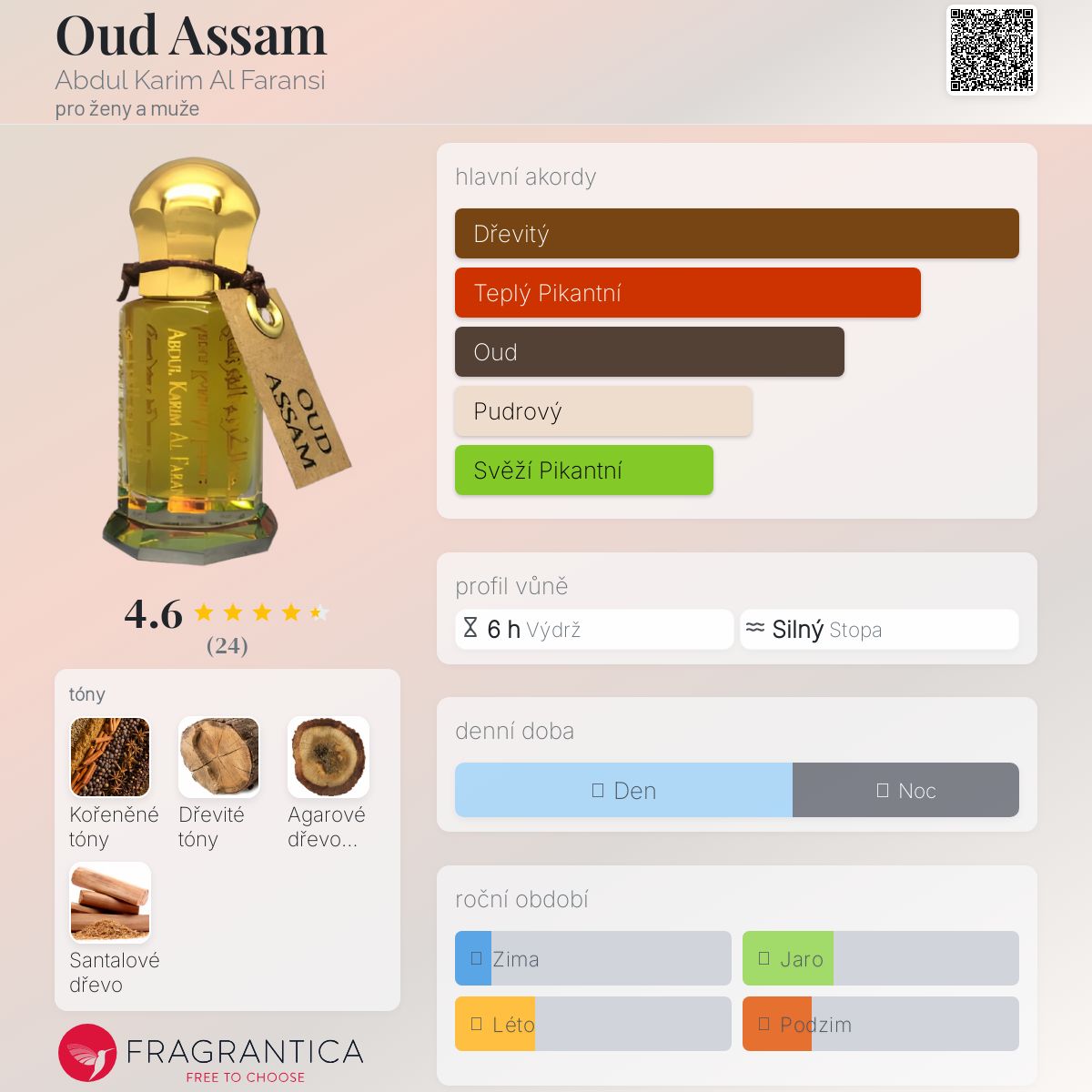 Oud Assam podle Abdul Karim Al Faransi je Orientální Woody vůně pro ženy a muže. Oud Assam byl/a uveden/a v roce 2017. "Nosem" za touto vůní je Anthony Abdul Karim Marmin. Vrchní tóny jsou Koření a Dřevité tóny; střední tóny jsouDřevité tóny a Santalové dřevo ; základní tón je Agarové dřevo (oud).