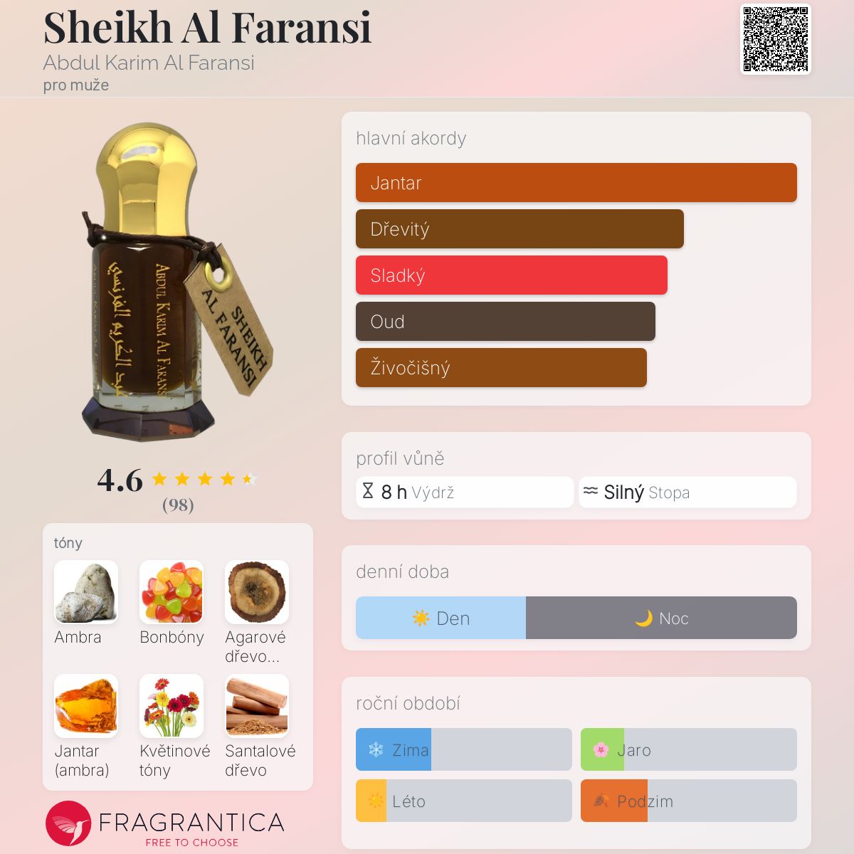Sheikh Al Faransi podle Abdul Karim Al Faransi je Woody vůně pro muže. Sheikh Al Faransi byl/a uveden/a v roce 2015. "Nosem" za touto vůní je Anthony Abdul Karim Marmin. Vrchní tóny jsou Jantar (ambra) a Dřevité tóny; střední tóny jsouAmbra, Sladké tóny a Květinové tóny ; základní tóny jsou Agarové dřevo (oud) a Santalové dřevo.