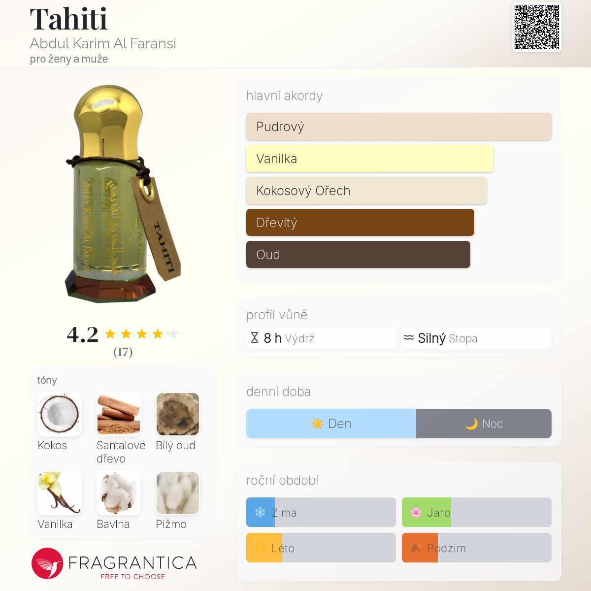 Tahiti podle Abdul Karim Al Faransi je Orientální vůně pro ženy a muže. Tahiti byl/a uveden/a v roce 2014. "Nosem" za touto vůní je Anthony Abdul Karim Marmin. Vrchní tóny jsou Tahitská vanilka a Bavlna; střední tóny jsouKokos a Bílé pižmo ; základní tóny jsou Santalové dřevo a Bílý oud.