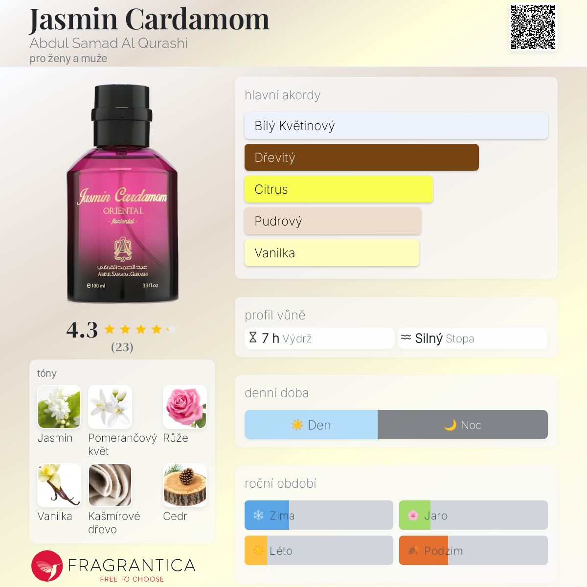 Jasmin Cardamom podle Abdul Samad Al Qurashi je Orientální Floral vůně pro ženy a muže. Jasmin Cardamom byl/a uveden/a v roce 2019. Vrchní tóny jsou Bergamot, Mandle, Citrón a Káva; střední tóny jsouJasmín Sambac, Pomerančový květ, Bulharská růže, Tuberóza a Orris ; základní tóny jsou Vanilka, Kašmírové dřevo, Cedr, Pižmo, Pralinka, Santalové dřevo, Skořice, Pačuli, Fazole tonka, Jantar (ambra) a Kakao.