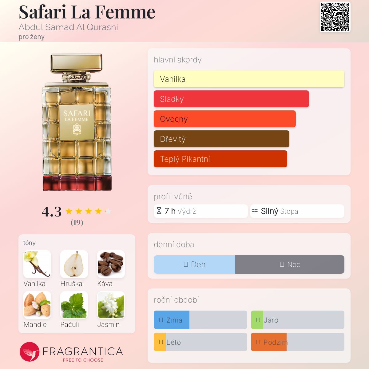 Safari La Femme podle Abdul Samad Al Qurashi je Orientální Vanilla vůně pro ženy. Safari La Femme byl/a uveden/a v roce 2019. Vrchní tóny jsou Hruška, Růžový pepř a Pomerančový květ; střední tóny jsouKáva, Hořká mandle, Jasmín a Lékořice ; základní tóny jsou Vanilka, Pačuli, Cedr a Kašmírové dřevo.