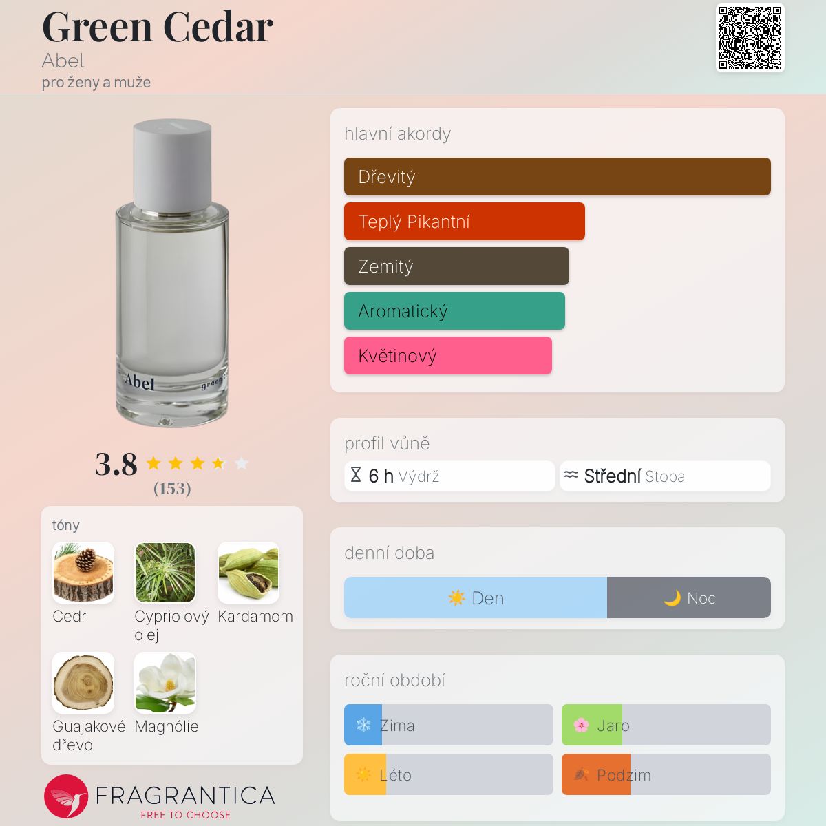 Green Cedar podle Abel je Woody Aromatic vůně pro ženy a muže. Green Cedar byl/a uveden/a v roce 2018. "Nosem" za touto vůní je Isaac Sinclair. Vrchní tóny jsou Kardamom a Magnólie; střední tóny jsouCypriolový olej a Guajakové dřevo ; základní tóny jsou Texaský cedr a Atlasový cedr.