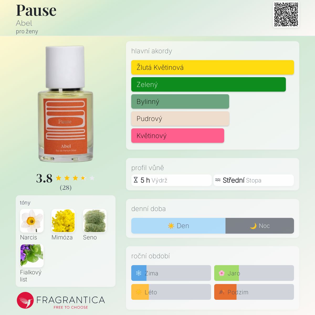 Pause podle Abel je Floral vůně pro ženy. Pause byl/a uveden/a v roce 2022. "Nosem" za touto vůní je Fanny Grau.