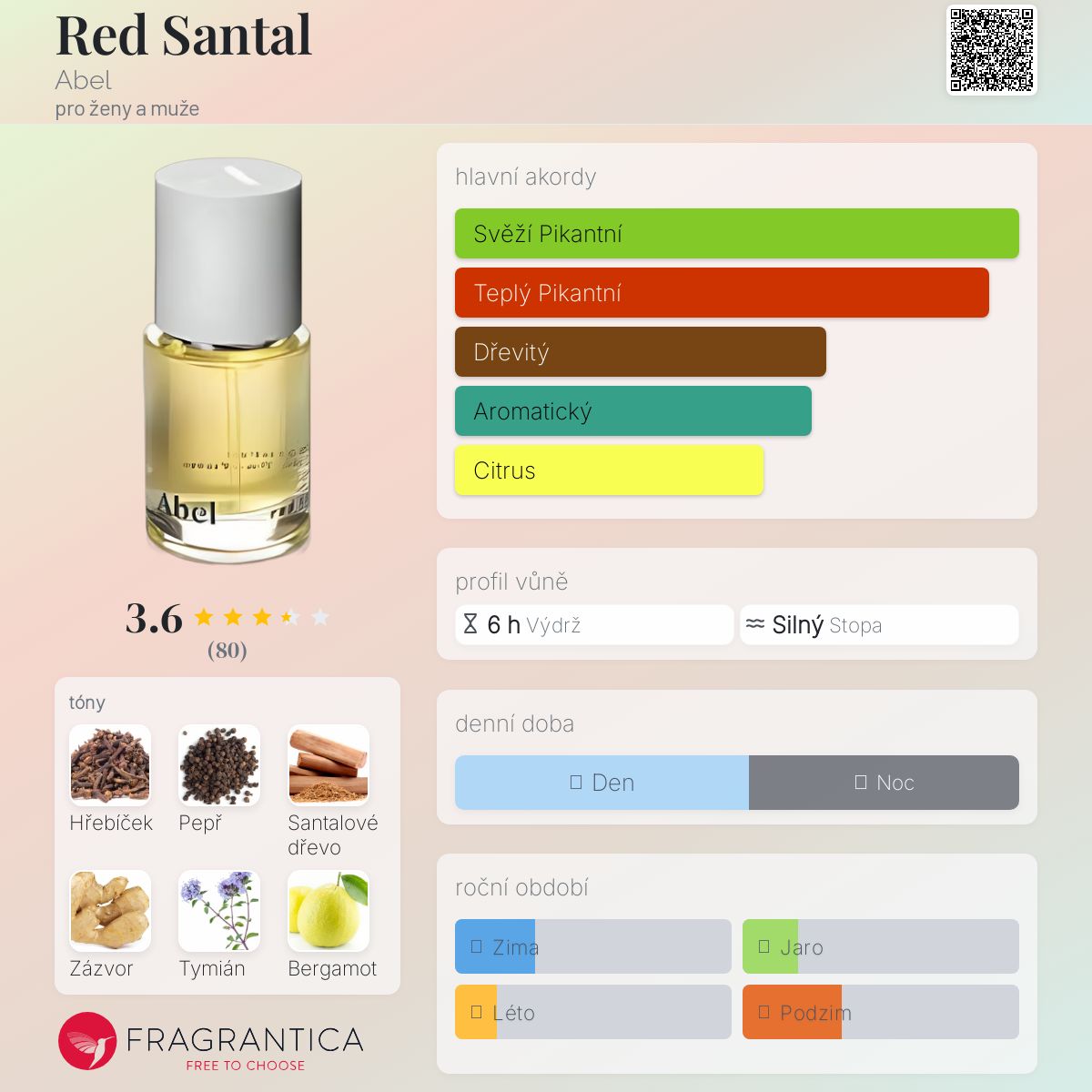 Red Santal podle Abel je Woody vůně pro ženy a muže. Red Santal byl/a uveden/a v roce 2016. "Nosem" za touto vůní je Isaac Sinclair. Vrchní tóny jsou Hřebíček a Černý a růžový pepř; střední tóny jsouZázvor, Tymián a Bergamot ; základní tóny jsou Santalové dřevo a Australské santalové dřevo.