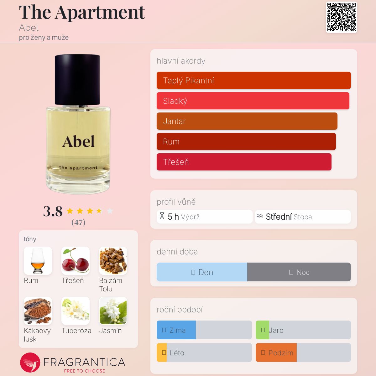 The Apartment podle Abel je vůně pro ženy a muže. Toto je nová vůně. The Apartment byl/a uveden/a v roce 2024. "Nosem" za touto vůní je Isaac Sinclair. Vrchní tóny jsou Rum a Třešeň; střední tóny jsouKakao, Tuberóza a Jasmín ; základní tóny jsou Balzám Tolu a Myrha.