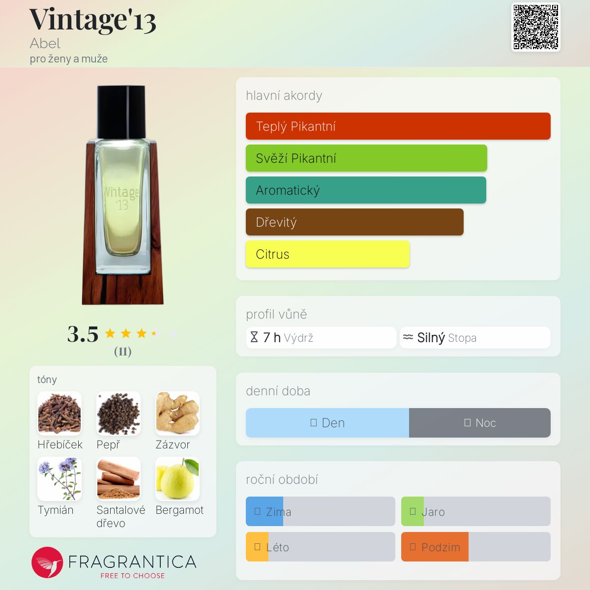 Vintage'13 podle Abel je Orientální Spicy vůně pro ženy a muže. Vintage'13 byl/a uveden/a v roce 2013. "Nosem" za touto vůní je Isaac Sinclair.