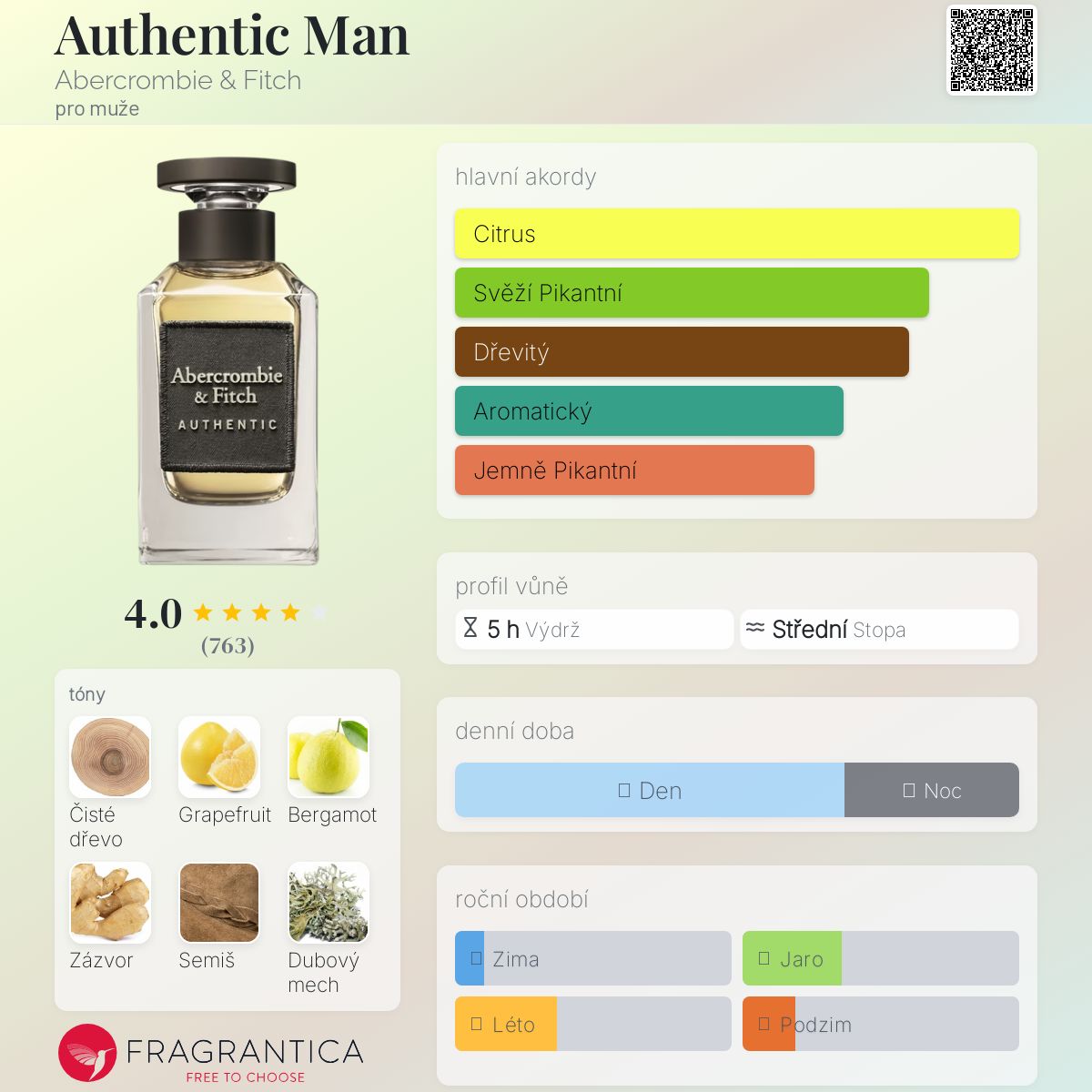 Authentic Man podle Abercrombie & Fitch je Citrus Aromatic vůně pro muže. Authentic Man byl/a uveden/a v roce 2019. "Nosem" za touto vůní je Clement Gavarry. Vrchní tóny jsou Grapefruit, Bergamot a Růžový pepř; střední tóny jsouZázvor, Šalvěj a Levandule ; základní tóny jsou Čisté dřevo, Semiš a Mech.