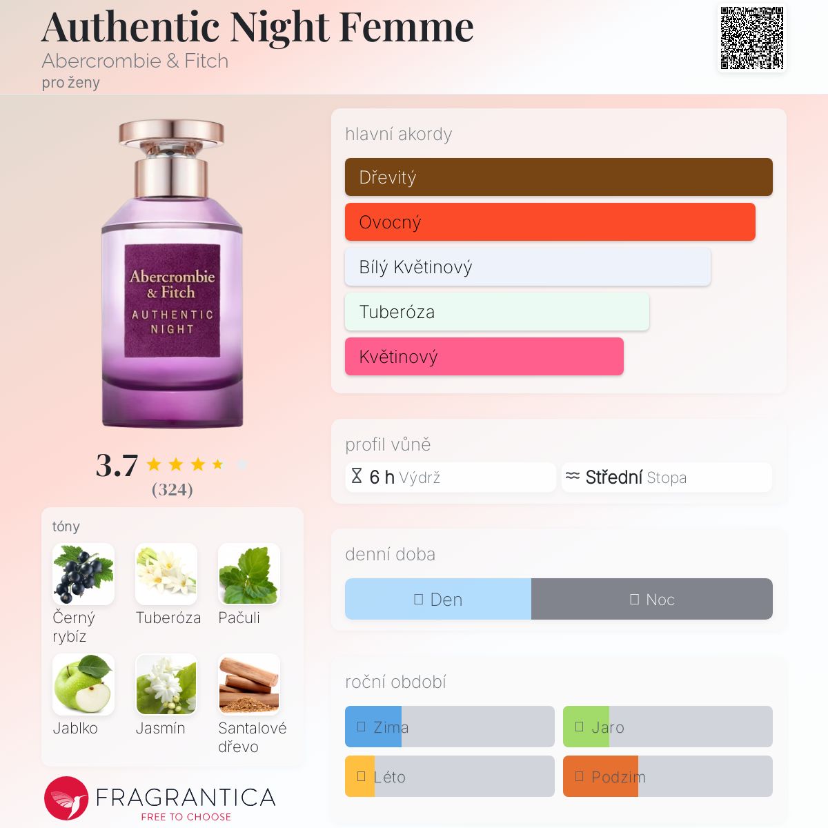 Authentic Night Femme podle Abercrombie & Fitch je Chypre Floral vůně pro ženy. Authentic Night Femme byl/a uveden/a v roce 2020. Vrchní tóny jsou Černý rybíz, Jablko a Růžový pepř; střední tóny jsouTuberóza, Jasmín Sambac a Magnólie ; základní tóny jsou Pačuli, Santalové dřevo a Cedr.