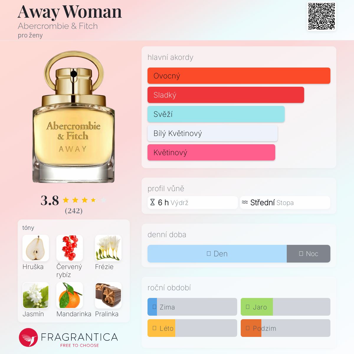 Away Woman podle Abercrombie & Fitch je Floral Fruity Gourmand vůně pro ženy. Away Woman byl/a uveden/a v roce 2021. Vrchní tóny jsou Hruška, Červený rybíz a Mandarinka; střední tóny jsouFrézie, Jasmín a Konvalinka ; základní tóny jsou Pralinka, Jantar (ambra) a Santalové dřevo.