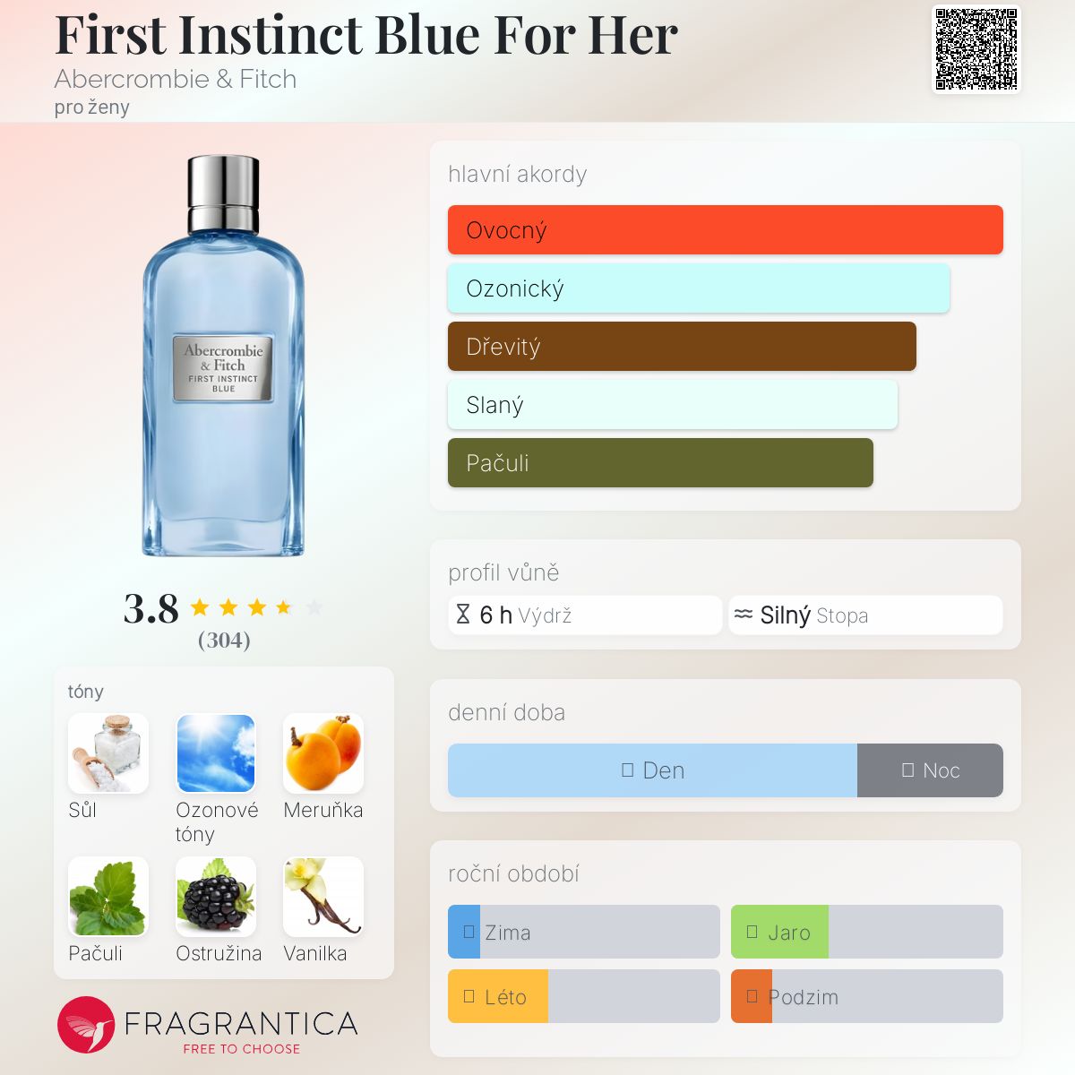 First Instinct Blue For Her podle Abercrombie & Fitch je Chypre Fruity vůně pro ženy. First Instinct Blue For Her byl/a uveden/a v roce 2018. "Nosem" za touto vůní je Gabriela Chelariu. Vrchní tóny jsou Sůl, Ozonové tóny, Ostružina a Bergamot; střední tóny jsouMeruňka, Pivoňka a Jasmín ; základní tóny jsou Pačuli, Vanilka a Santalové dřevo.